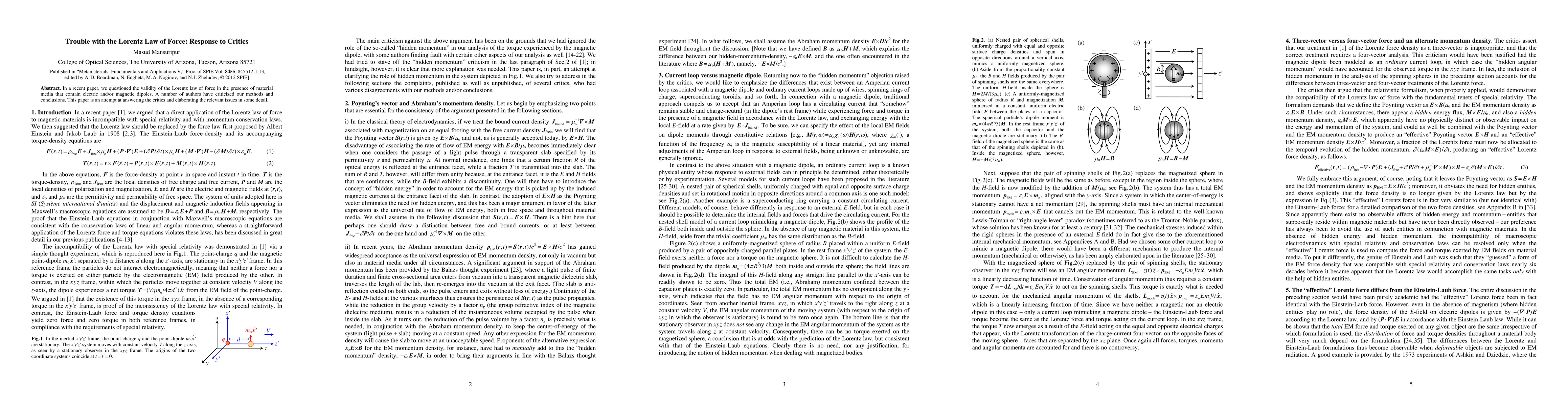 In a recent paper [arXiv:1205.0096], we questioned the validity of the Lorentz law of force in the presence of material media that contain electric and/or magnetic dipoles. A number of authors have criticized our methods and conclusions. This paper is an attempt at answering the critics and elaborating the relevant issues in some detail.
