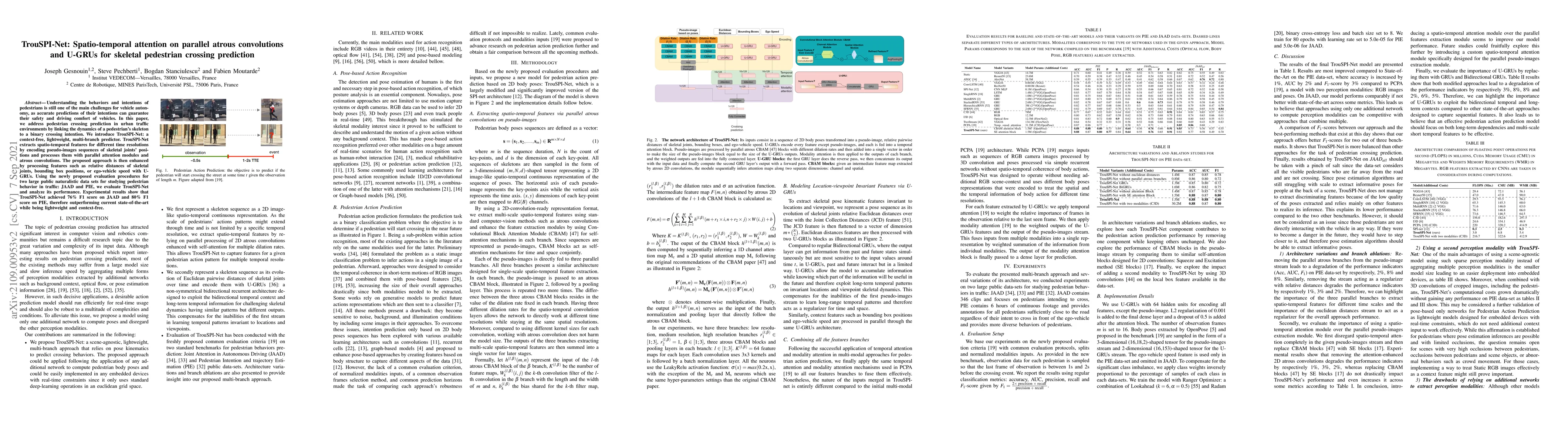 TrouSPI-Net introduces a lightweight, multi-branch predictor for predicting pedestrian crossing intentions using skeletal data and spatio-temporal attention. It outperforms current methods with a F1 score of 0.76 on JAAD and 0.80 on PIE datasets.
