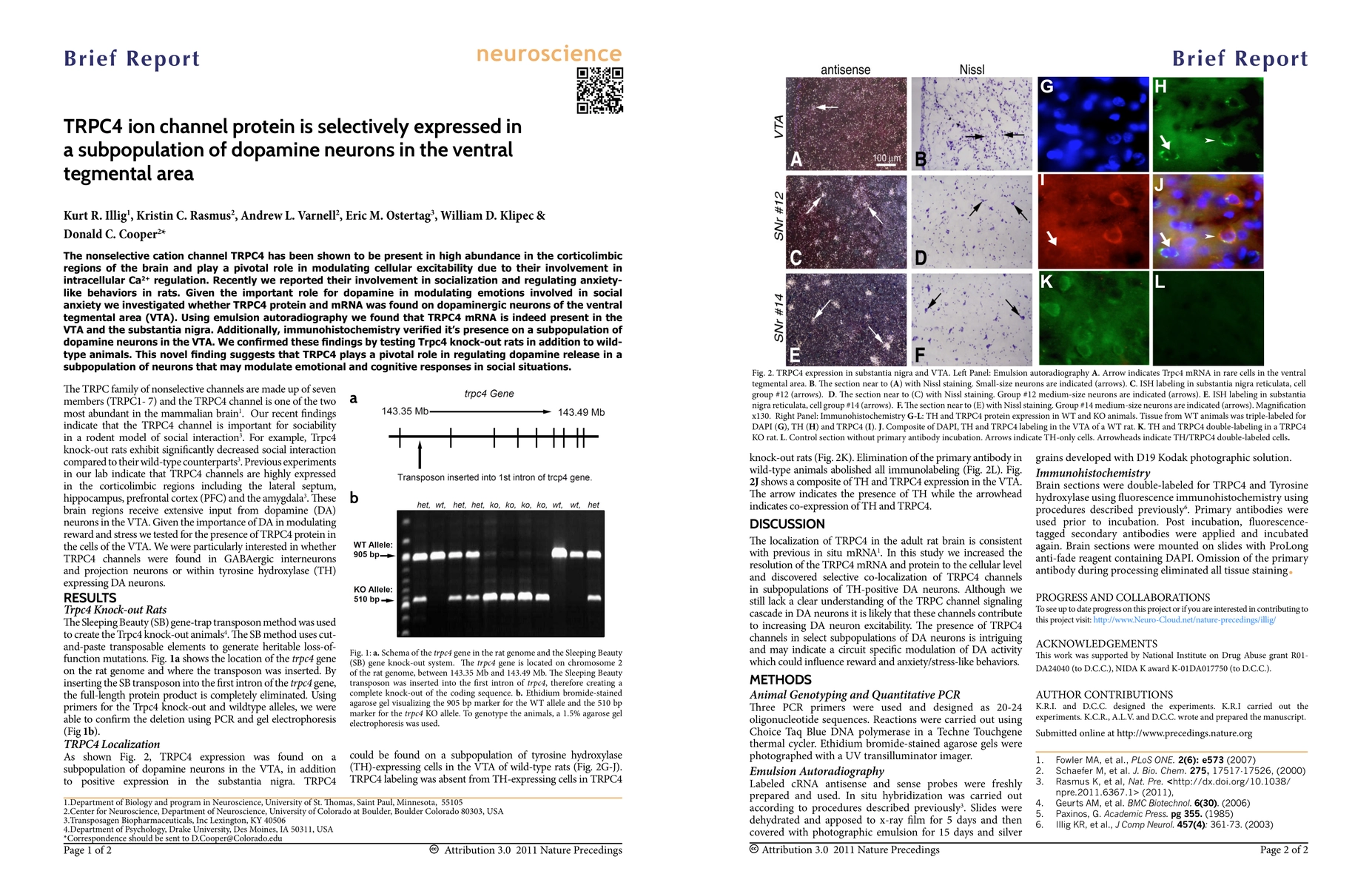 The TRPC4 ion channel protein is selectively expressed in a subset of dopamine neurons in the ventral tegmental area (VTA), suggesting its role in modulating dopamine release and potentially influencing emotional and cognitive responses in social contexts. These findings were confirmed through mRNA detection, immunohistochemistry, and behavioral studies in Trpc4 knock-out and wild-type rats.
