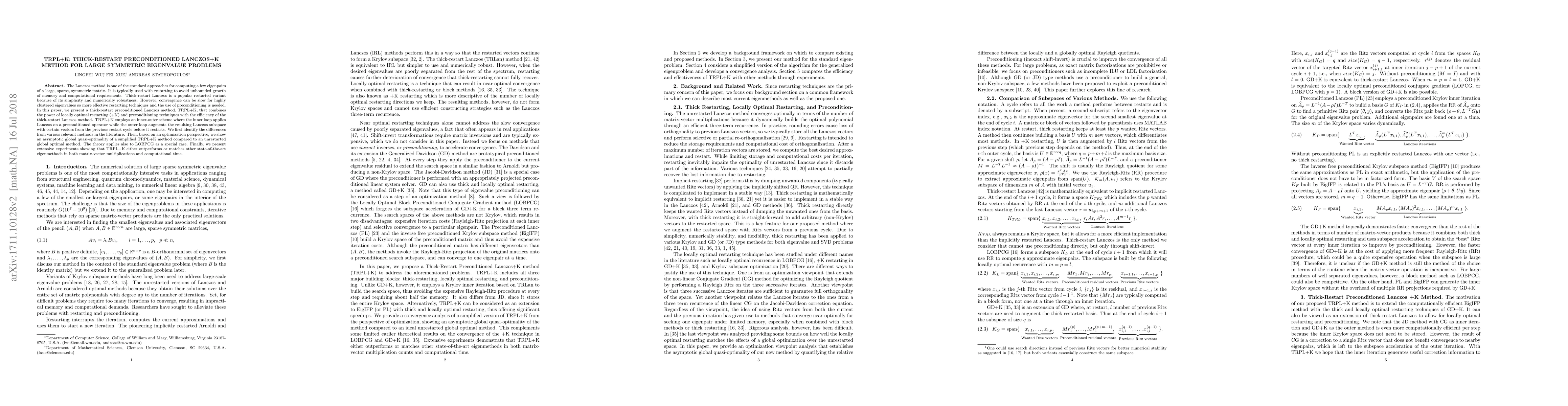 This paper introduces TRPL+K, a thick-restart preconditioned Lanczos method that combines locally optimal restarting and preconditioning techniques to improve the efficiency of computing eigenpairs for large, sparse, symmetric matrices. Extensive experiments demonstrate that TRPL+K outperforms or matches other state-of-the-art methods in terms of computational time and matrix-vector multiplications.