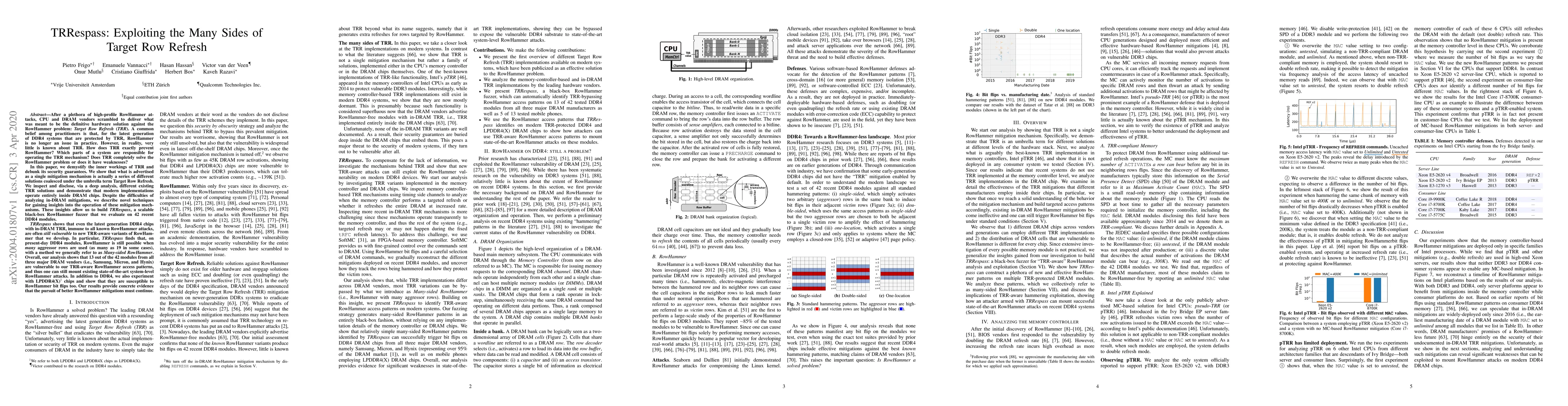 This paper explores the vulnerabilities of Target Row Refresh (TRR) in DDR4 DRAM, revealing that despite TRR's promise to mitigate RowHammer attacks, many modern DRAM modules remain susceptible. The authors develop TRRespass, a new RowHammer fuzzer, demonstrating that 13 out of 42 tested modules are still vulnerable to advanced RowHammer techniques, including the Many-sided RowHammer method.