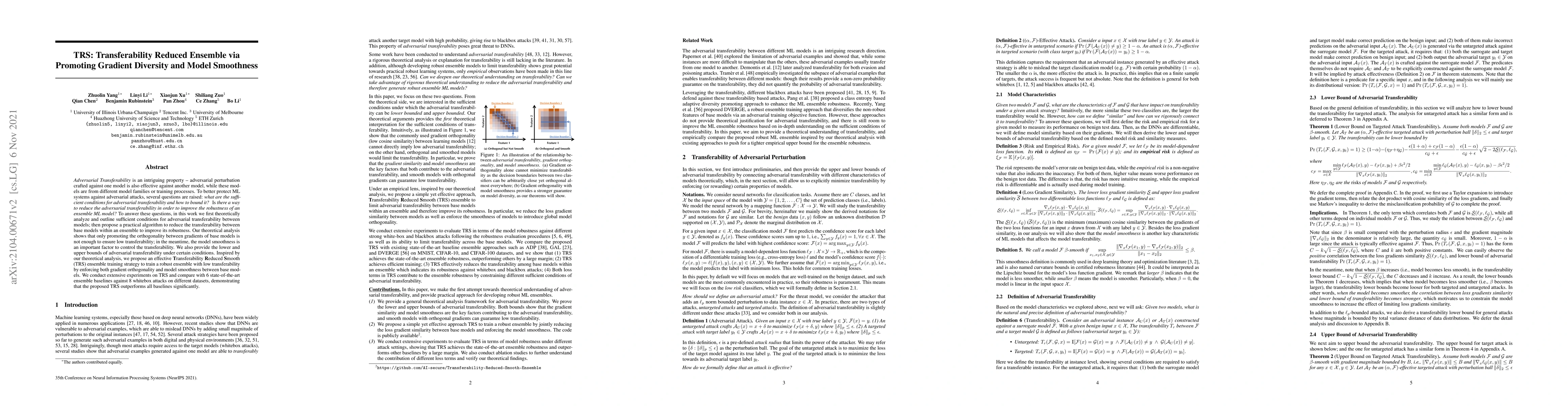 Adversarial Transferability is an intriguing property - adversarial perturbation crafted against one model is also effective against another model, while these models are from different model families or training processes. To better protect ML systems against adversarial attacks, several questions are raised: what are the sufficient conditions for adversarial transferability and how to bound it? Is there a way to reduce the adversarial transferability in order to improve the robustness of an ensemble ML model? To answer these questions, in this work we first theoretically analyze and outline sufficient conditions for adversarial transferability between models; then propose a practical algorithm to reduce the transferability between base models within an ensemble to improve its robustness. Our theoretical analysis shows that only promoting the orthogonality between gradients of base models is not enough to ensure low transferability; in the meantime, the model smoothness is an important factor to control the transferability. We also provide the lower and upper bounds of adversarial transferability under certain conditions. Inspired by our theoretical analysis, we propose an effective Transferability Reduced Smooth(TRS) ensemble training strategy to train a robust ensemble with low transferability by enforcing both gradient orthogonality and model smoothness between base models. We conduct extensive experiments on TRS and compare with 6 state-of-the-art ensemble baselines against 8 whitebox attacks on different datasets, demonstrating that the proposed TRS outperforms all baselines significantly.