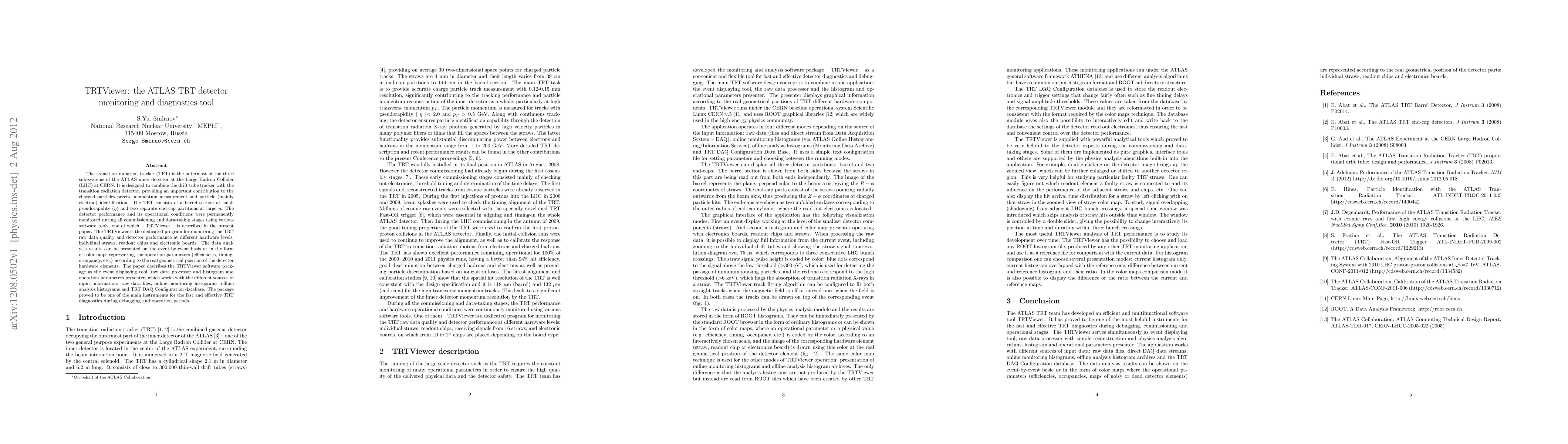 The TRTViewer software package is a diagnostic tool for the ATLAS Transition Radiation Tracker (TRT) detector at the Large Hadron Collider, allowing for fast and effective monitoring of detector performance and operational conditions.