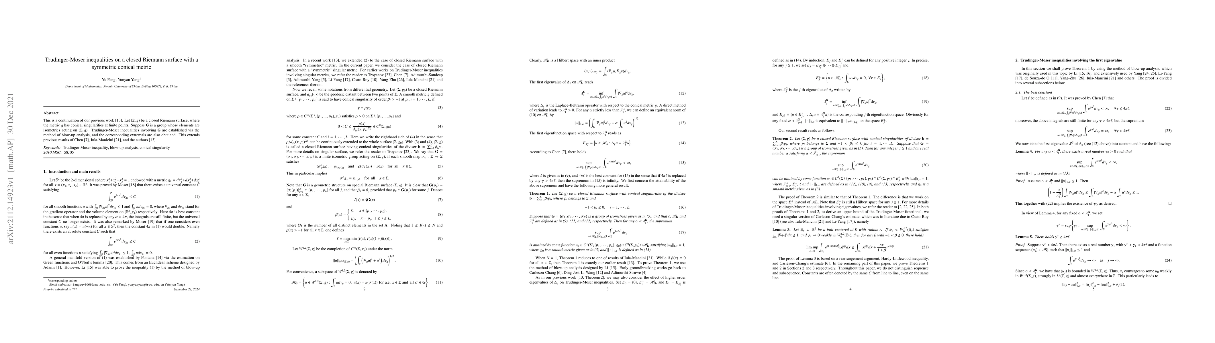 This paper extends previous results on Trudinger-Moser inequalities on a closed Riemann surface with conical singularities, establishing new inequalities and extremals via blow-up analysis and isometries from the group $\mathbf{G}$. This builds on earlier work by the authors and other researchers.