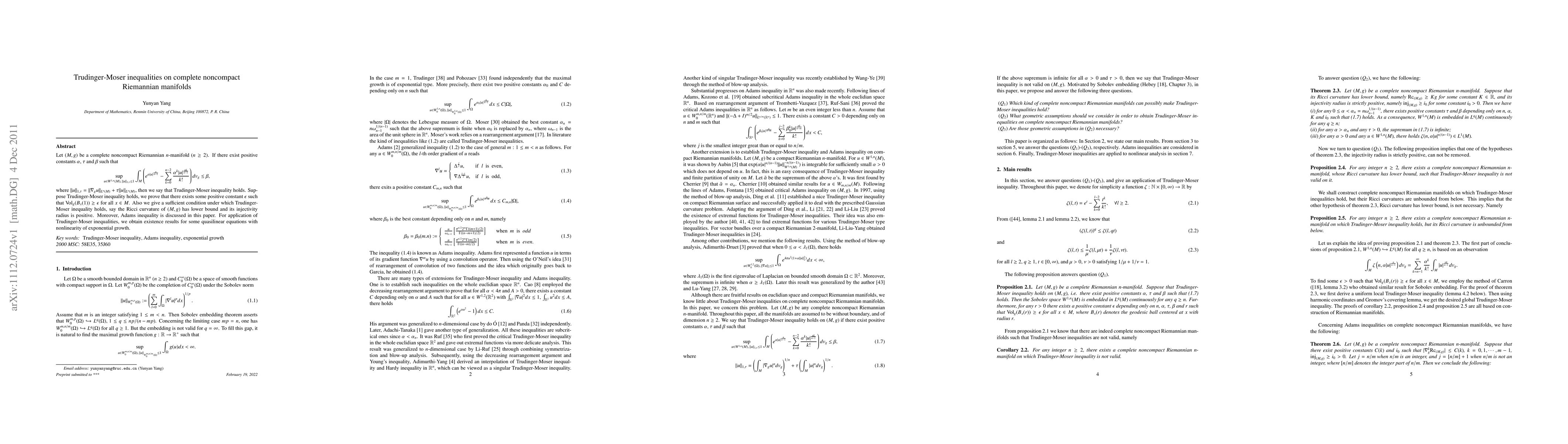 This paper establishes necessary and sufficient conditions for Trudinger-Moser inequalities on complete noncompact Riemannian manifolds, providing insights into their behavior in such settings and demonstrating applications in solving quasilinear equations with exponential growth nonlinearity.