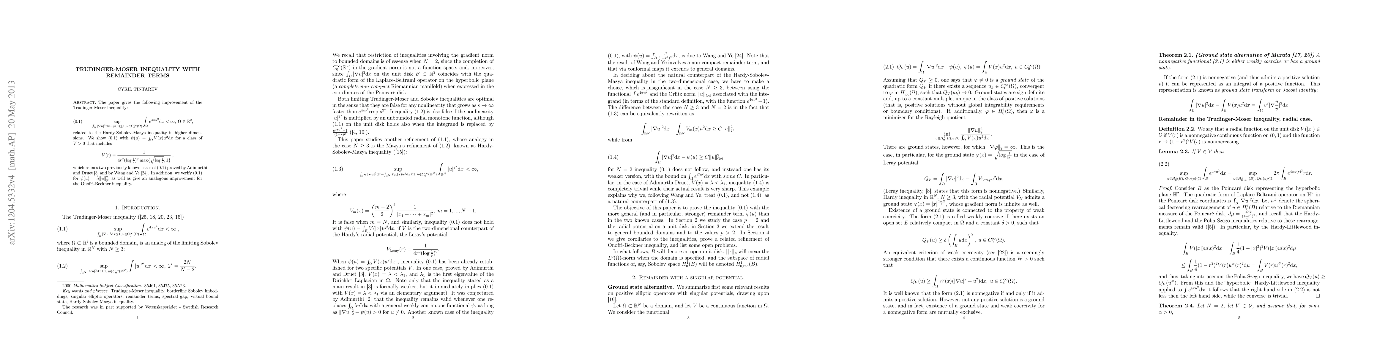 The paper improves the Trudinger-Moser inequality by introducing remainder terms of weighted L^p-type, generalizing previous results for potential-type remainders and extending the inequality to L^p-remainder cases, p>2. It also provides an analogous improvement for the Onofri-Beckner inequality.