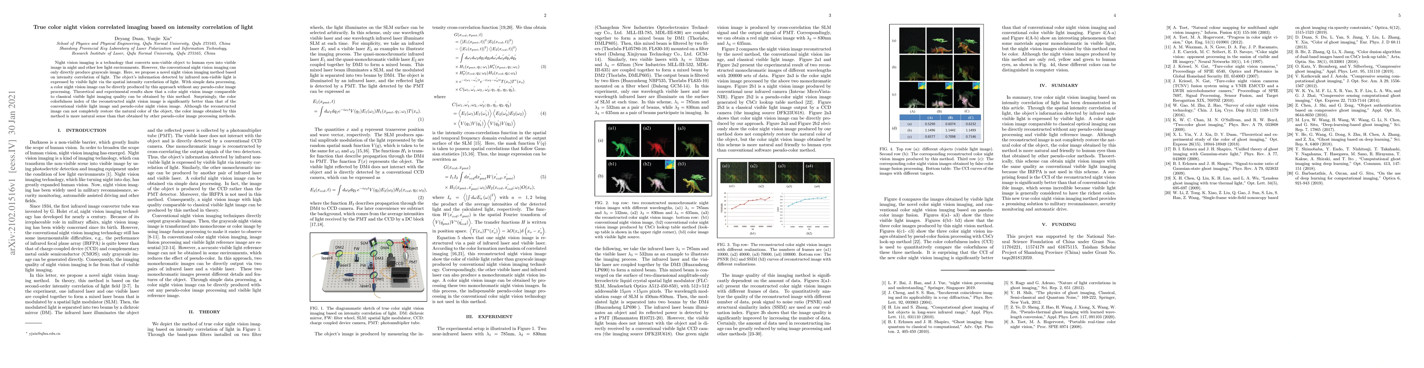 This paper proposes a novel night vision imaging method that converts non-visible infrared light into a true color visible image based on spatial intensity correlation, achieving better color representation than conventional grayscale or pseudo-color night vision methods. The method produces a more natural color image compared to traditional approaches.