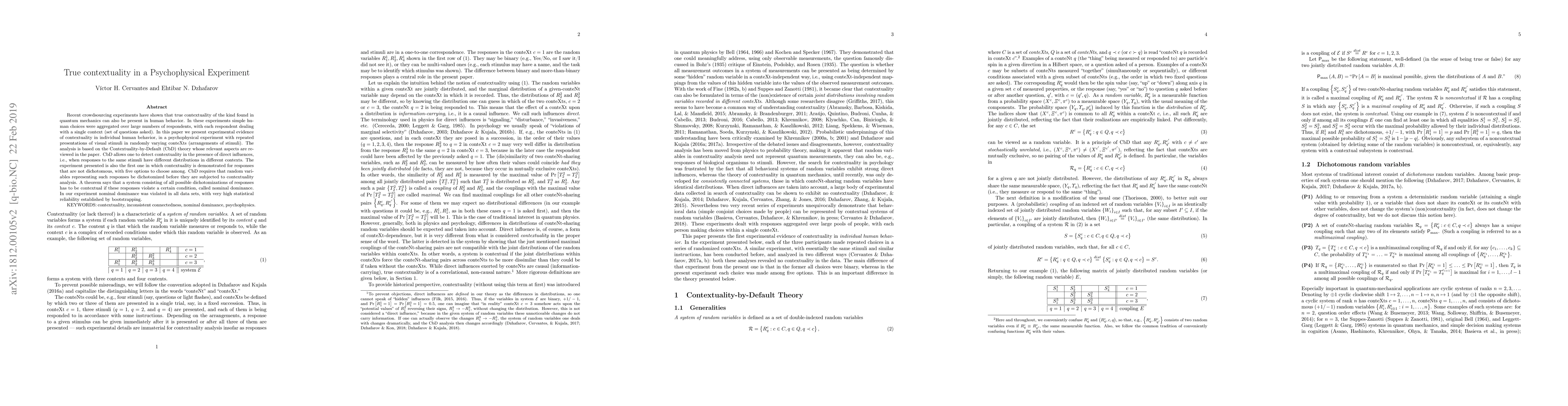 Recent crowdsourcing experiments have shown that true contextuality of the kind found in quantum mechanics can also be present in human behavior. In these experiments simple human choices were aggregated over large numbers of respondents, with each respondent dealing with a single context (set of questions asked). In this paper we present experimental evidence of contextuality in individual human behavior, in a psychophysical experiment with repeated presentations of visual stimuli in randomly varying contexts (arrangements of stimuli). The analysis is based on the Contextuality-by-Default (CbD) theory whose relevant aspects are reviewed in the paper. CbD allows one to detect contextuality in the presence of direct influences, i.e., when responses to the same stimuli have different distributions in different contexts. The experiment presented is also the first one in which contextuality is demonstrated for responses that are not dichotomous, with five options to choose among. CbD requires that random variables representing such responses be dichotomized before they are subjected to contextuality analysis. A theorem says that a system consisting of all possible dichotomizations of responses has to be contextual if these responses violate a certain condition, called nominal dominance. In our experiment nominal dominance was violated in all data sets, with very high statistical reliability established by bootstrapping.