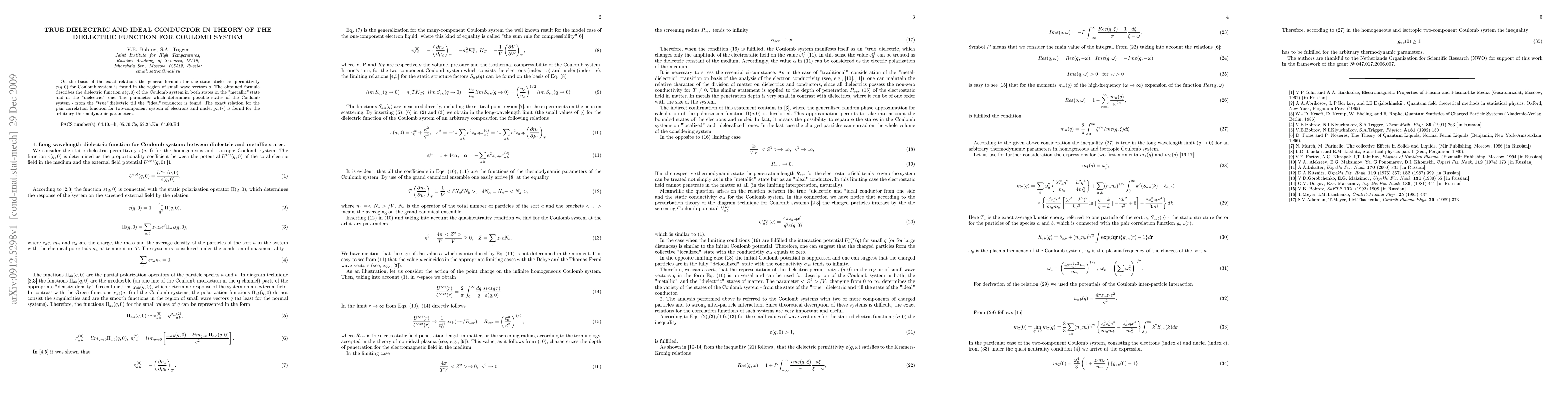 On the basis of the exact relations the general formula for the static dielectric permittivity e(q,0) for Coulomb system is found in the region of small wave vectors q. The obtained formuladescribes the dielectric function e(q,0) of the Coulomb system in both states in the "metallic" state and in the "dielectric" one. The parameter which determines possible states of the Coulomb system - from the "true" dielectric till the "ideal" conductor is found. The exact relation for the pair correlation function for two-component system of electrons and nuclei g_ei(r) is found for the arbitrary thermodynamic parameters.