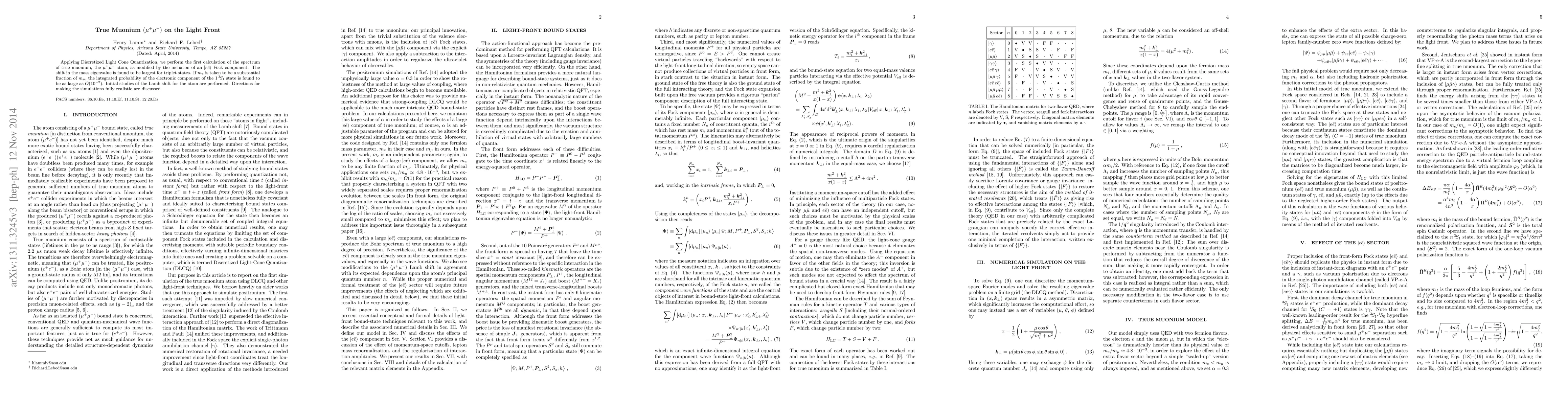 The paper presents the first DLCQ calculation of True Muonium spectrum, incorporating an $|e\\bar e >$ Fock component, and initiates the study of Lamb shift for this system.