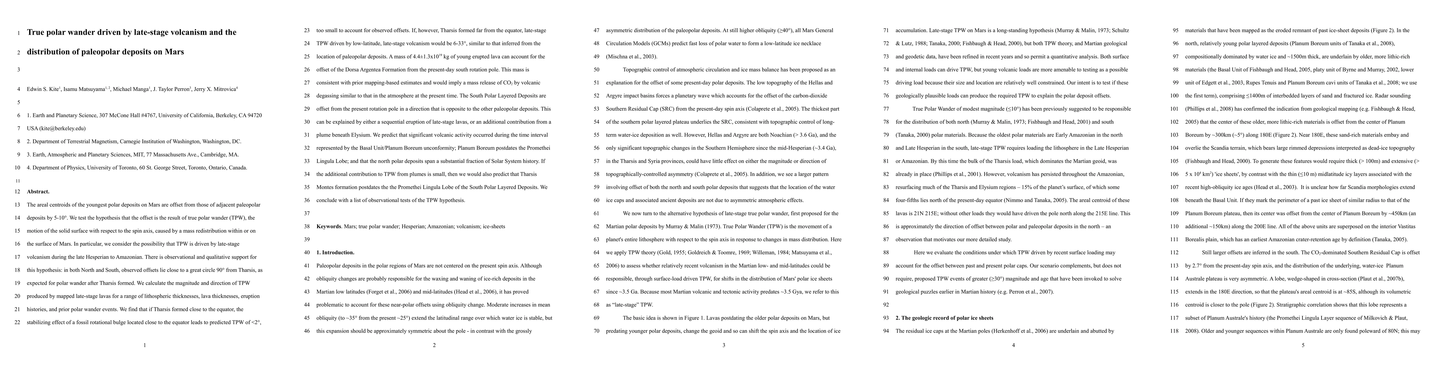 This research investigates the hypothesis that true polar wander (TPW) on Mars, driven by late-stage volcanism, explains the observed offsets of paleopolar deposits. The study finds that if Tharsis formed far from the equator, late-stage volcanism could produce TPW of 6-33 degrees, aligning with the observed offsets.