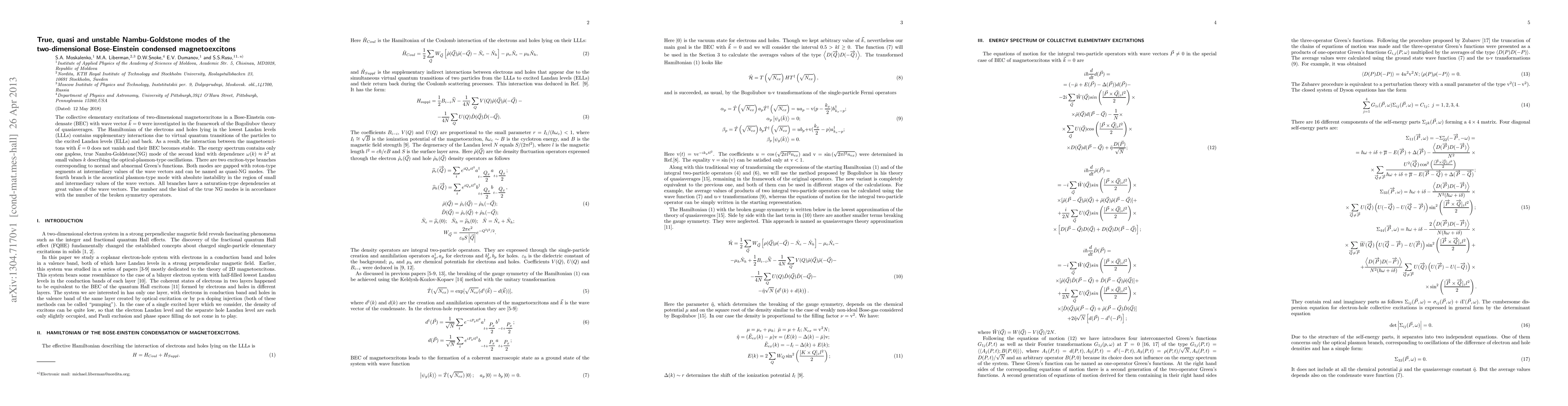 This paper investigates the collective excitations in two-dimensional magnetoexcitons within a Bose Einstein condensate, revealing a true Nambu Goldstone mode and two quasi Nambu Goldstone modes. The study also identifies an unstable acoustical plasmon mode, all of which are influenced by interactions and exhibit saturation at large wavevectors.