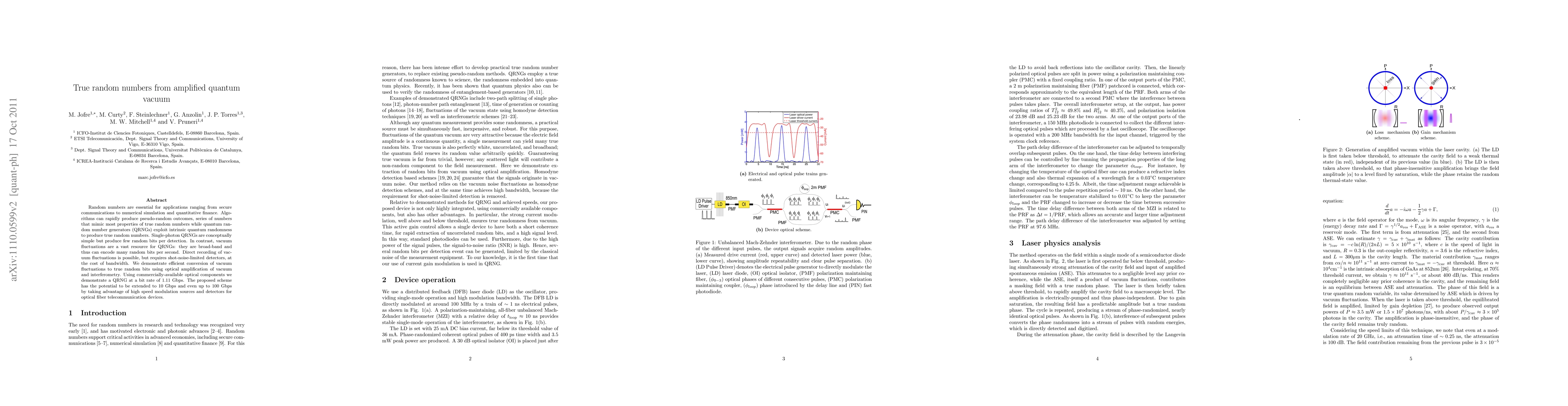 This paper presents a quantum random number generator (QRNG) that efficiently converts vacuum fluctuations into true random bits using optical amplification and interferometry, achieving a bit rate of 1.11 Gbps with commercially-available components, with potential for scaling up to 10 Gbps or even 100 Gbps.