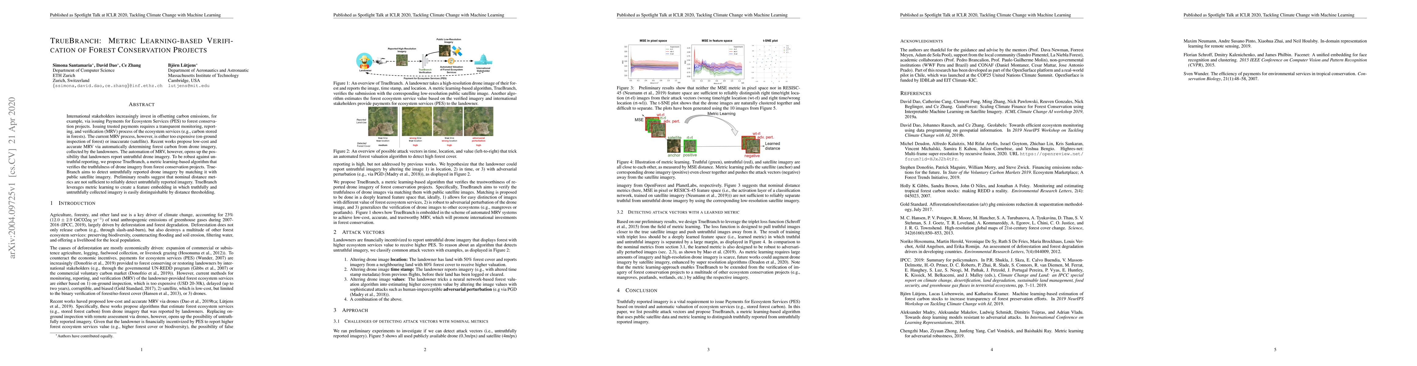 TrueBranch uses metric learning to verify the accuracy of drone imagery used for forest conservation projects, detecting untruthful reporting by matching it with public satellite imagery.