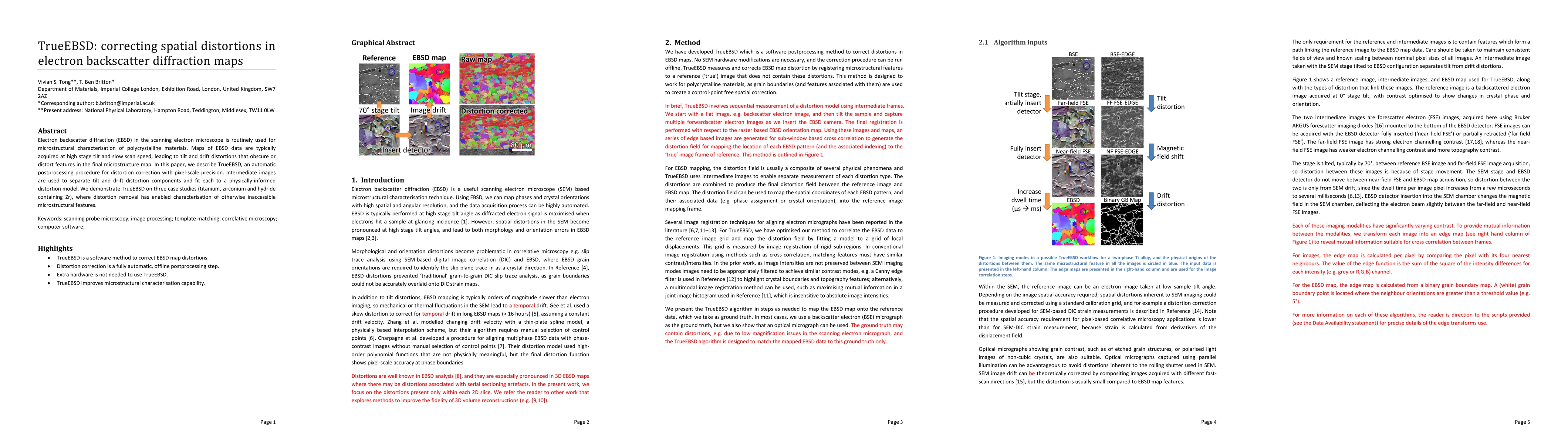 TrueEBSD is an automatic postprocessing method for correcting spatial distortions in electron backscatter diffraction (EBSD) maps, using intermediate images to separate and model tilt and drift distortions. This technique enables the characterization of microstructural features previously obscured by distortions in materials like titanium, zirconium, and hydride-containing Zr.