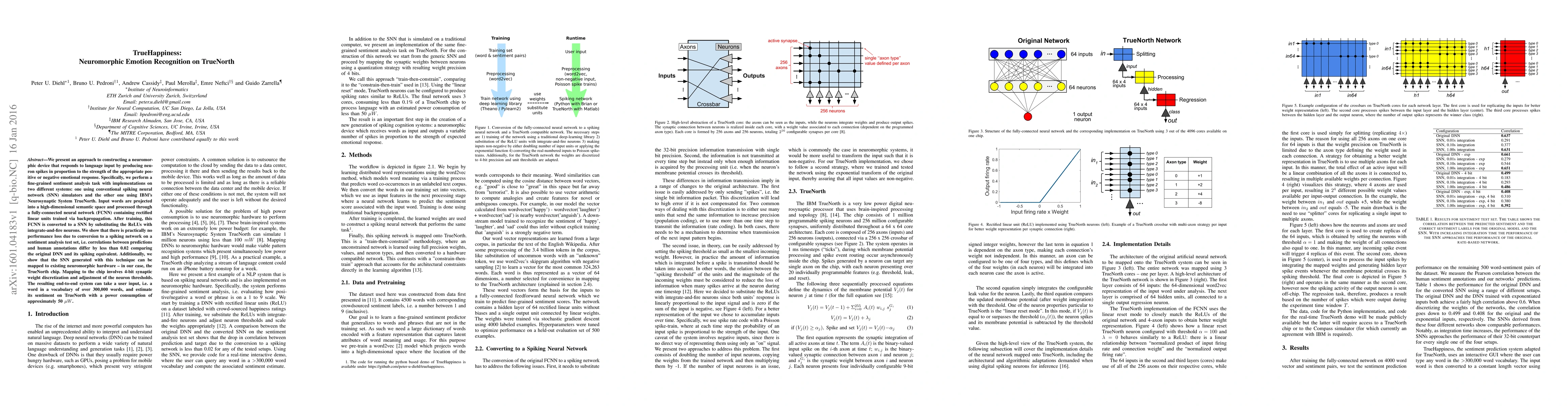 We present an approach to constructing a neuromorphic device that responds to language input by producing neuron spikes in proportion to the strength of the appropriate positive or negative emotional response. Specifically, we perform a fine-grained sentiment analysis task with implementations on two different systems: one using conventional spiking neural network (SNN) simulators and the other one using IBM's Neurosynaptic System TrueNorth. Input words are projected into a high-dimensional semantic space and processed through a fully-connected neural network (FCNN) containing rectified linear units trained via backpropagation. After training, this FCNN is converted to a SNN by substituting the ReLUs with integrate-and-fire neurons. We show that there is practically no performance loss due to conversion to a spiking network on a sentiment analysis test set, i.e. correlations between predictions and human annotations differ by less than 0.02 comparing the original DNN and its spiking equivalent. Additionally, we show that the SNN generated with this technique can be mapped to existing neuromorphic hardware -- in our case, the TrueNorth chip. Mapping to the chip involves 4-bit synaptic weight discretization and adjustment of the neuron thresholds. The resulting end-to-end system can take a user input, i.e. a word in a vocabulary of over 300,000 words, and estimate its sentiment on TrueNorth with a power consumption of approximately 50 uW.