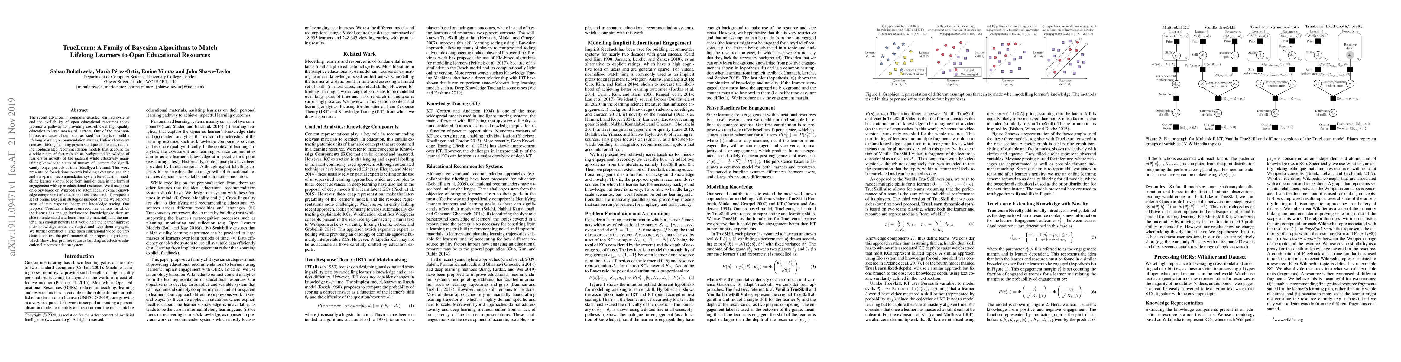 TrueLearn introduces Bayesian algorithms to dynamically recommend open educational resources to lifelong learners, balancing learner background knowledge with material novelty. The system uses a text ontology from Wikipedia to model educational content and employs online Bayesian strategies for scalable, transparent recommendations.