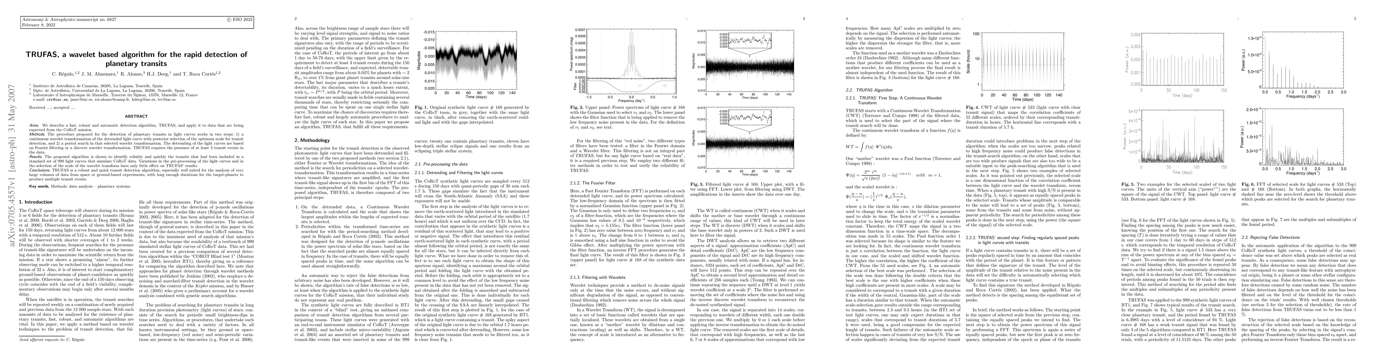 TRUFAS is a fast, robust algorithm for detecting planetary transits using wavelet transformations, successfully identifying transits in simulated CoRoT mission data. It efficiently processes large datasets by requiring at least three transit events and shows minimal sensitivity to variations in pre-processing.