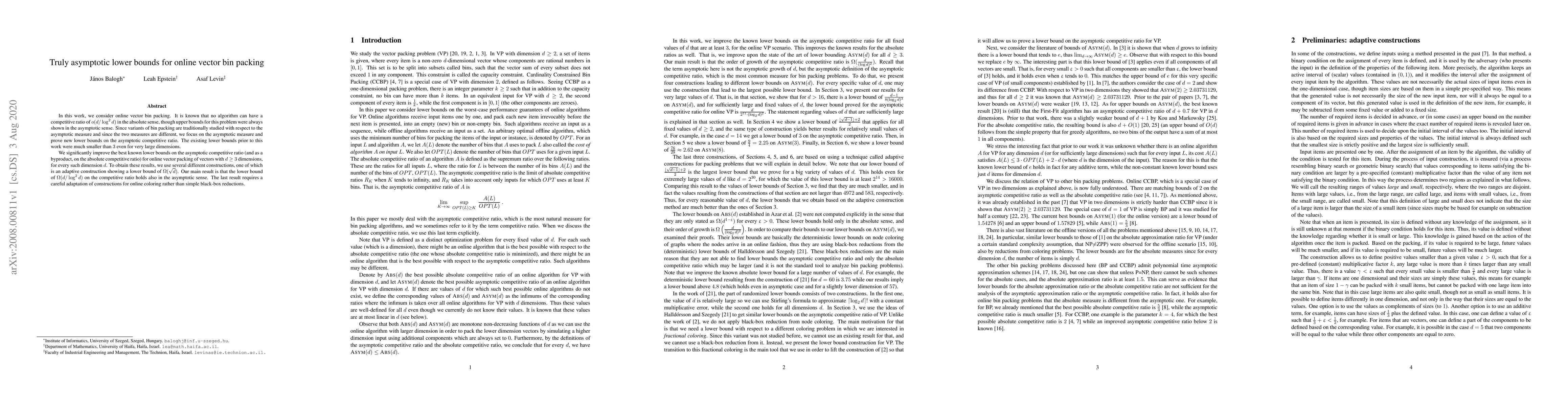 In this work, we consider online vector bin packing. It is known that no algorithm can have a competitive ratio of $o(d/\log^2 d)$ in the absolute sense, though upper bounds for this problem were always shown in the asymptotic sense. Since variants of bin packing are traditionally studied with respect to the asymptotic measure and since the two measures are different, we focus on the asymptotic measure and prove new lower bounds on the asymptotic competitive ratio. The existing lower bounds prior to this work were much smaller than $3$ even for very large dimensions. We significantly improve the best known lower bounds on the asymptotic competitive ratio (and as a byproduct, on the absolute competitive ratio) for online vector packing of vectors with $d \geq 3$ dimensions, for every such dimension $d$. To obtain these results, we use several different constructions, one of which is an adaptive construction showing a lower bound of $\Omega(\sqrt{d})$. Our main result is that the lower bound of $\Omega(d/\log^2 d)$ on the competitive ratio holds also in the asymptotic sense. The last result requires a careful adaptation of constructions for online coloring rather than simple black-box reductions.