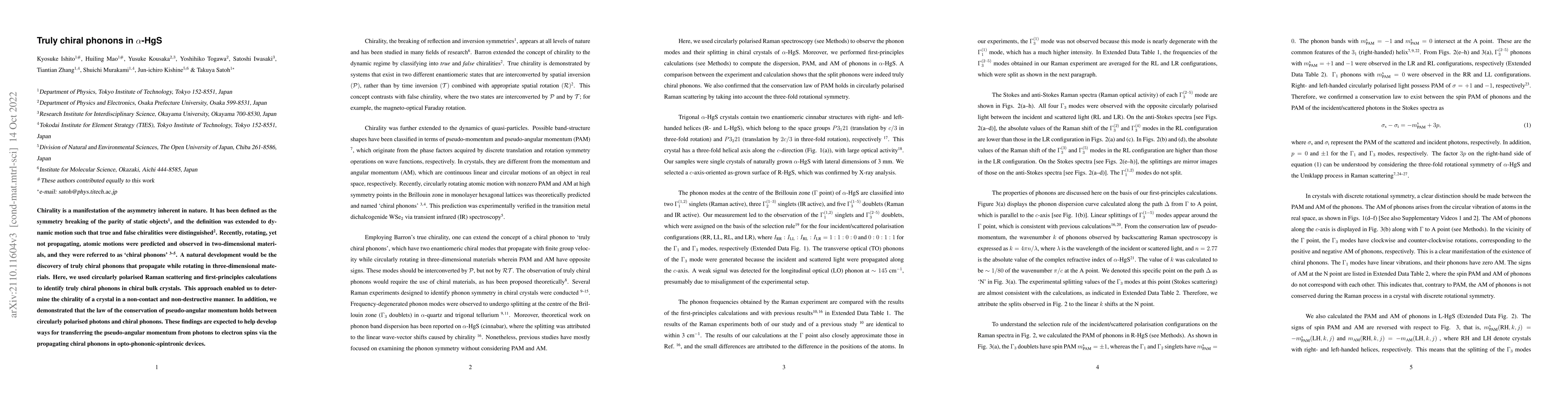 This paper identifies truly chiral phonons in α-HgS using circularly polarised Raman scattering and first-principles calculations, demonstrating their propagation while rotating. The findings support the conservation of pseudo-angular momentum between photons and chiral phonons, potentially aiding the development of opto-phononic-spintronic devices.