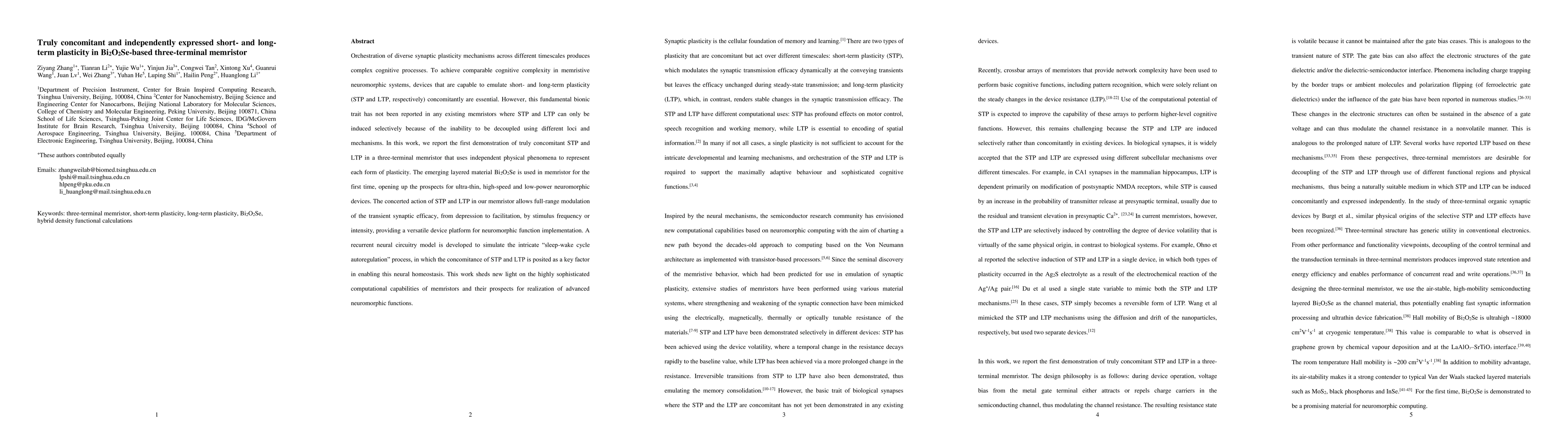 Orchestration of diverse synaptic plasticity mechanisms across different timescales produces complex cognitive processes. To achieve comparable cognitive complexity in memristive neuromorphic systems, devices that are capable to emulate short- and long-term plasticity (STP and LTP, respectively) concomitantly are essential. However, this fundamental bionic trait has not been reported in any existing memristors where STP and LTP can only be induced selectively because of the inability to be decoupled using different loci and mechanisms. In this work, we report the first demonstration of truly concomitant STP and LTP in a three-terminal memristor that uses independent physical phenomena to represent each form of plasticity. The emerging layered material Bi2O2Se is used in memristor for the first time, opening up the prospects for ultra-thin, high-speed and low-power neuromorphic devices. The concerted action of STP and LTP in our memristor allows full-range modulation of the transient synaptic efficacy, from depression to facilitation, by stimulus frequency or intensity, providing a versatile device platform for neuromorphic function implementation. A recurrent neural circuitry model is developed to simulate the intricate "sleep-wake cycle autoregulation" process, in which the concomitance of STP and LTP is posited as a key factor in enabling this neural homeostasis. This work sheds new light on the highly sophisticated computational capabilities of memristors and their prospects for realization of advanced neuromorphic functions.