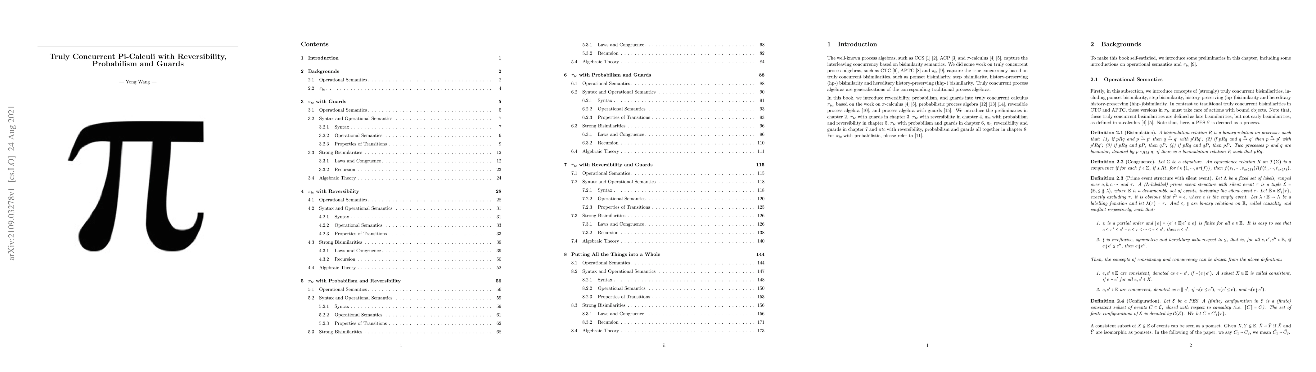 The well-known process algebras, such as CCS, ACP and $\pi$-calculus, capture the interleaving concurrency based on bisimilarity semantics. We did some work on truly concurrent process algebras, such as CTC, APTC and $\pi_{tc}$, capture the true concurrency based on truly concurrent bisimilarities, such as pomset bisimilarity, step bisimilarity, history-preserving (hp-) bisimilarity and hereditary history-preserving (hhp-) bisimilarity. Truly concurrent process algebras are generalizations of the corresponding traditional process algebras. In this book, we introduce reversibility, probabilism, and guards into truly concurrent calculus $\pi_{tc}$.