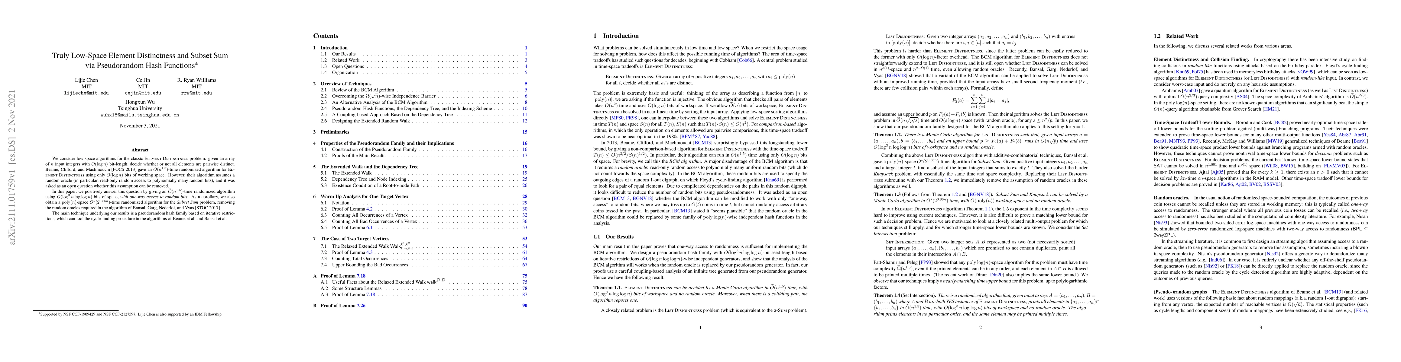 This paper presents a low-space randomized algorithm for the Element Distinctness problem, achieving $\tilde O(n^{1.5})$ time with $O(\log^3 n \log \log n)$ bits of space, eliminating the need for a random oracle. As a result, it also provides a $\operatorname{\mathrm{poly}}(n)$-space $O^*(2^{0.86n})$-time algorithm for the Subset Sum problem, removing the previous reliance on random oracles.