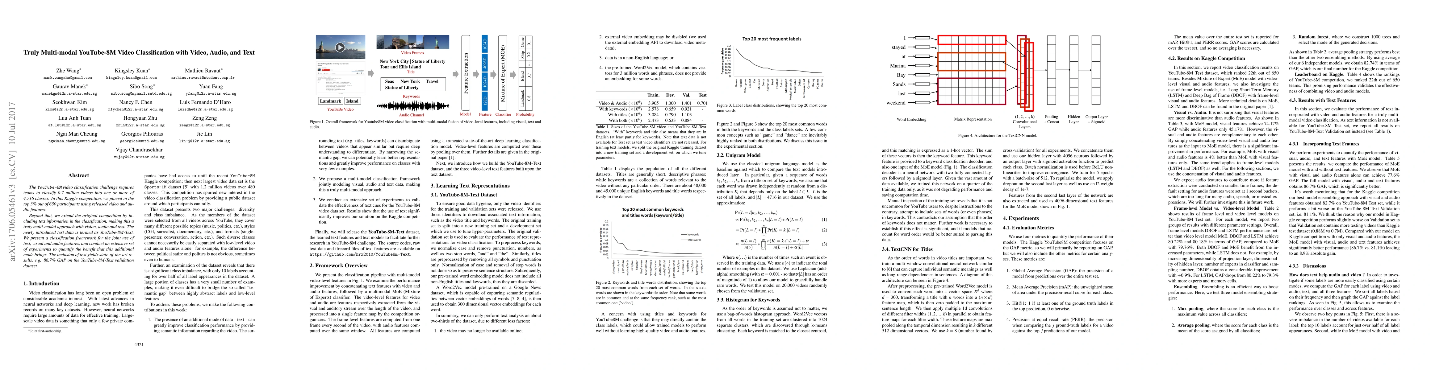 The YouTube-8M video classification challenge requires teams to classify 0.7 million videos into one or more of 4,716 classes. In this Kaggle competition, we placed in the top 3% out of 650 participants using released video and audio features. Beyond that, we extend the original competition by including text information in the classification, making this a truly multi-modal approach with vision, audio and text. The newly introduced text data is termed as YouTube-8M-Text. We present a classification framework for the joint use of text, visual and audio features, and conduct an extensive set of experiments to quantify the benefit that this additional mode brings. The inclusion of text yields state-of-the-art results, e.g. 86.7% GAP on the YouTube-8M-Text validation dataset.