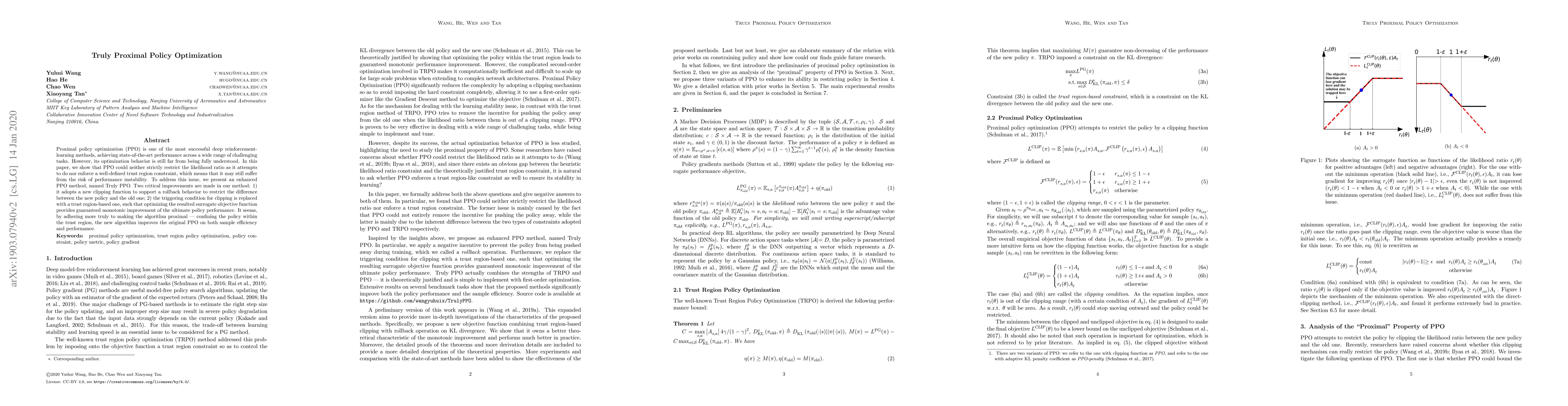 Proximal policy optimization (PPO) is one of the most successful deep reinforcement-learning methods, achieving state-of-the-art performance across a wide range of challenging tasks. However, its optimization behavior is still far from being fully understood. In this paper, we show that PPO could neither strictly restrict the likelihood ratio as it attempts to do nor enforce a well-defined trust region constraint, which means that it may still suffer from the risk of performance instability. To address this issue, we present an enhanced PPO method, named Truly PPO. Two critical improvements are made in our method: 1) it adopts a new clipping function to support a rollback behavior to restrict the difference between the new policy and the old one; 2) the triggering condition for clipping is replaced with a trust region-based one, such that optimizing the resulted surrogate objective function provides guaranteed monotonic improvement of the ultimate policy performance. It seems, by adhering more truly to making the algorithm proximal - confining the policy within the trust region, the new algorithm improves the original PPO on both sample efficiency and performance.