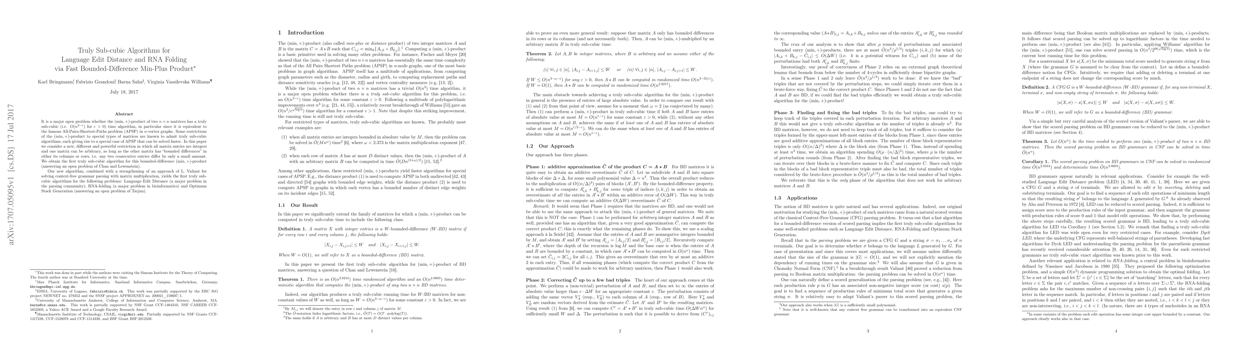 This paper presents truly sub-cubic algorithms for language edit distance, RNA folding, and optimum stack generation, solving major open problems in parsing and bioinformatics. It achieves this by introducing a new restriction for bounded-difference min-plus product, which is then applied to these problems, surpassing previous cubic time complexities.