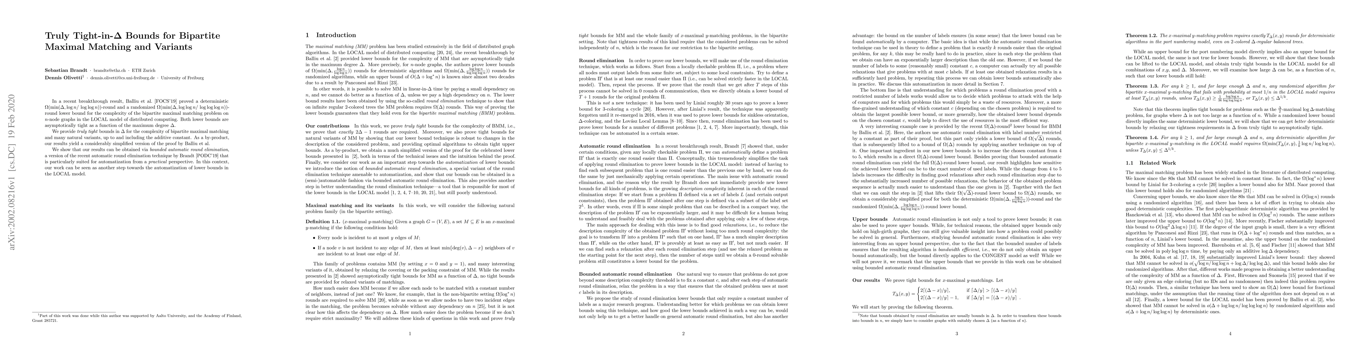 In a recent breakthrough result, Balliu et al. [FOCS'19] proved a deterministic $\Omega(\min(\Delta,\log n /\log \log n))$-round and a randomized $\Omega(\min(\Delta,\log \log n/\log \log \log n))$-round lower bound for the complexity of the bipartite maximal matching problem on $n$-node graphs in the LOCAL model of distributed computing. Both lower bounds are asymptotically tight as a function of the maximum degree $\Delta$. We provide truly tight bounds in $\Delta$ for the complexity of bipartite maximal matching and many natural variants, up to and including the additive constant. As a by-product, our results yield a considerably simplified version of the proof by Balliu et al. We show that our results can be obtained via bounded automatic round elimination, a version of the recent automatic round elimination technique by Brandt [PODC'19] that is particularly suited for automatization from a practical perspective. In this context, our work can be seen as another step towards the automatization of lower bounds in the LOCAL model.
