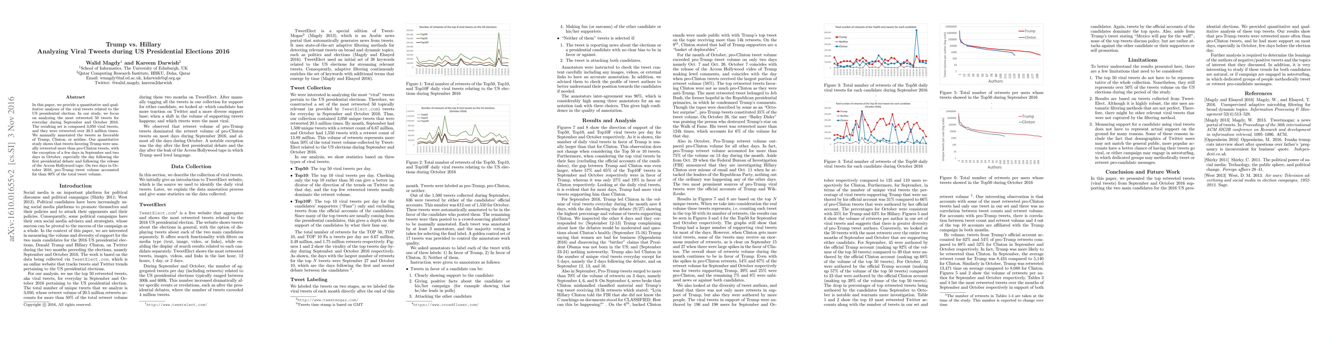This paper quantitatively and qualitatively analyzes the 50 most retweeted tweets each day during September and October 2016, totaling 3,050 tweets that garnered over 20.5 million retweets. It finds that pro-Trump tweets generally had higher retweet counts than pro-Clinton tweets, except around key events like the first debate and the Access Hollywood tape release.
