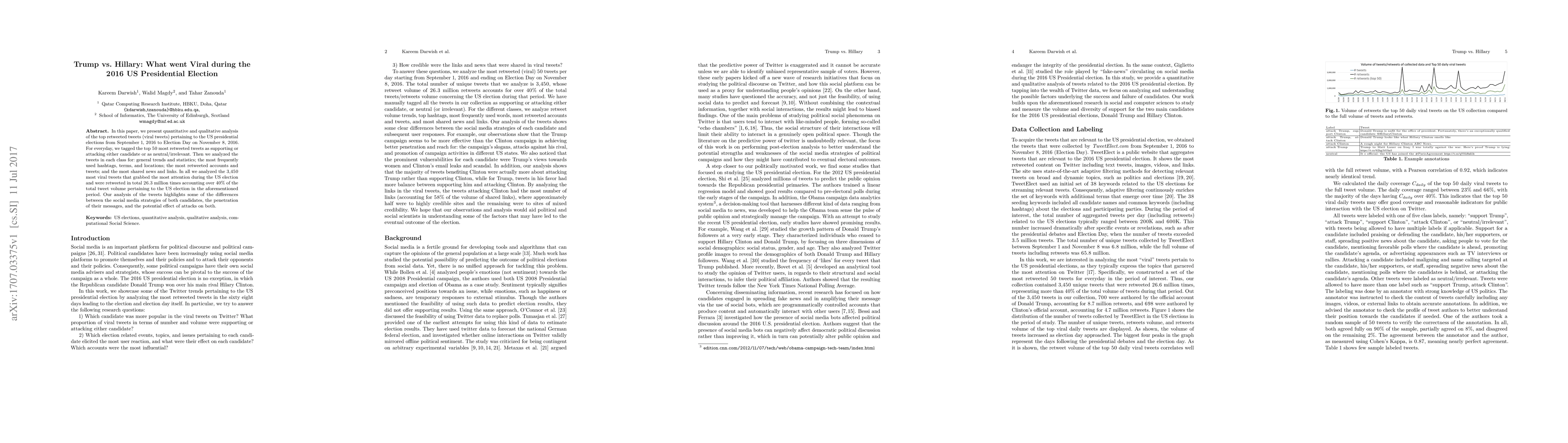 In this paper, we present quantitative and qualitative analysis of the top retweeted tweets (viral tweets) pertaining to the US presidential elections from September 1, 2016 to Election Day on November 8, 2016. For everyday, we tagged the top 50 most retweeted tweets as supporting or attacking either candidate or as neutral/irrelevant. Then we analyzed the tweets in each class for: general trends and statistics; the most frequently used hashtags, terms, and locations; the most retweeted accounts and tweets; and the most shared news and links. In all we analyzed the 3,450 most viral tweets that grabbed the most attention during the US election and were retweeted in total 26.3 million times accounting over 40% of the total tweet volume pertaining to the US election in the aforementioned period. Our analysis of the tweets highlights some of the differences between the social media strategies of both candidates, the penetration of their messages, and the potential effect of attacks on both