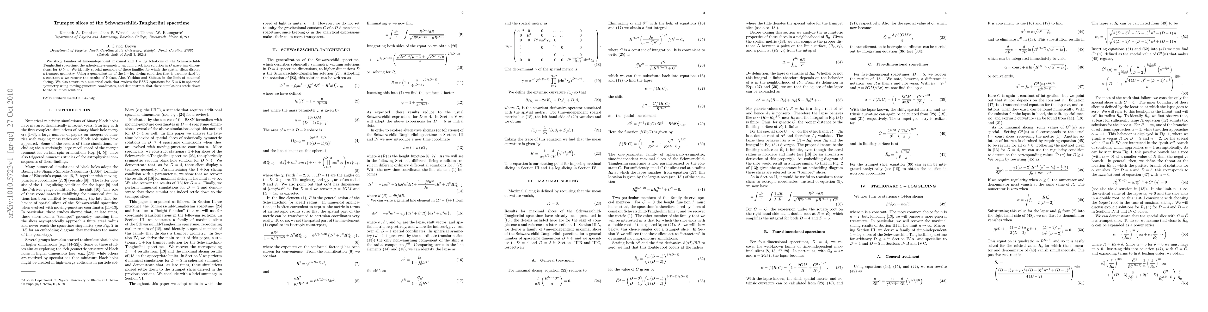 This paper investigates maximal and 1+log foliations of the Schwarzschild-Tangherlini spacetime, identifying spatial slices with a trumpet geometry. It also develops a numerical code to simulate the BSSN equations in D=5, showing convergence to these trumpet solutions.