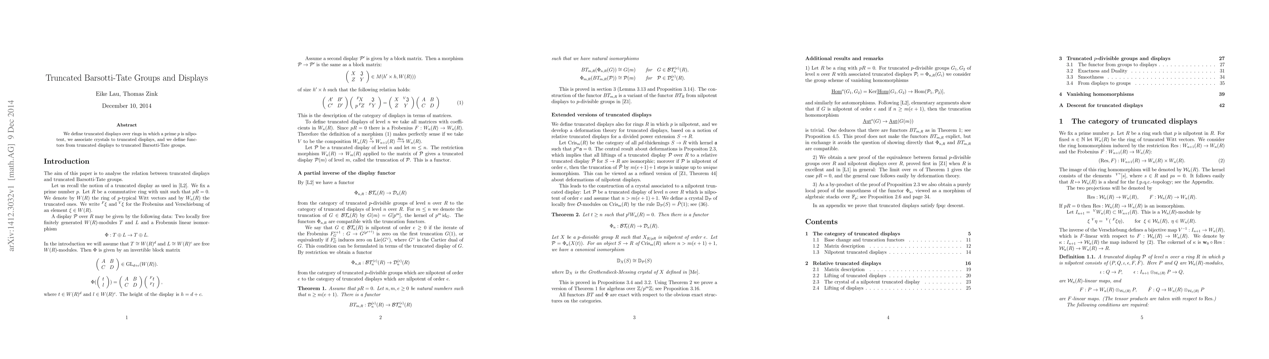 This paper introduces truncated displays over rings where a prime p is nilpotent, establishes a connection between these displays and crystals, and defines functors linking truncated displays to truncated Barsotti-Tate groups. The work aims to advance the understanding of algebraic structures in this context.