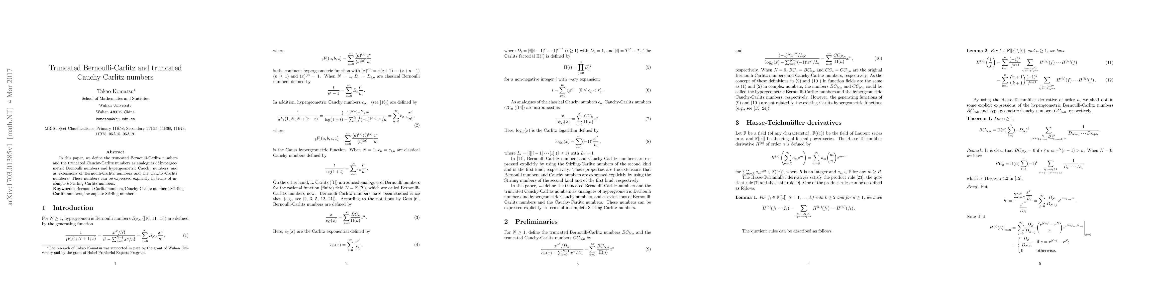 This paper introduces truncated Bernoulli-Carlitz and truncated Cauchy-Carlitz numbers, providing explicit expressions for them in terms of incomplete Stirling-Carlitz numbers, and positioning them as extensions of existing Bernoulli-Carlitz and Cauchy-Carlitz numbers.