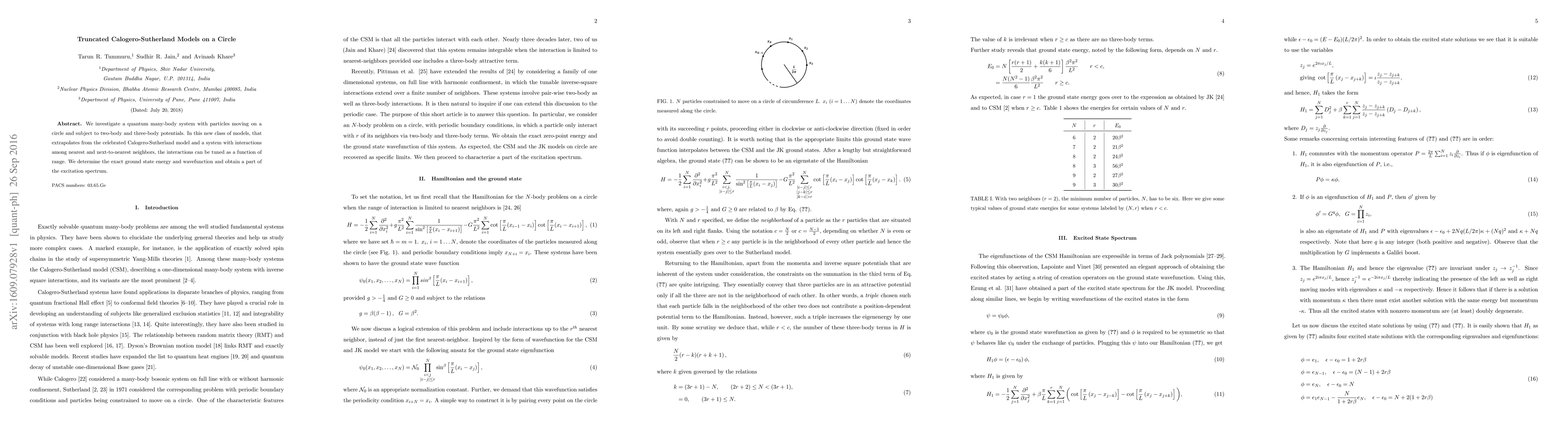 The study examines a quantum many-body system on a circle with tunable two-body and three-body interactions, deriving the exact ground state energy and wavefunction, and exploring part of the excitation spectrum.