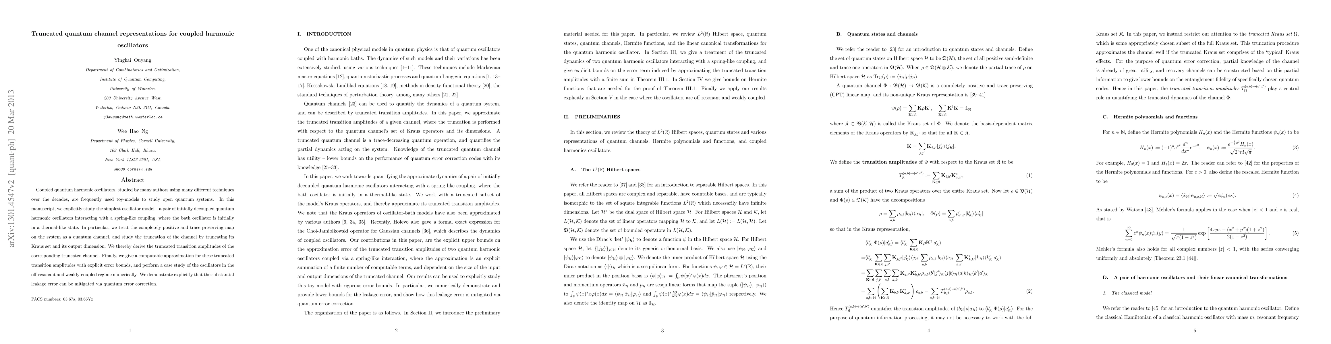 This research paper investigates a model of coupled quantum harmonic oscillators, focusing on a pair of initially decoupled oscillators interacting via a spring-like coupling. The study treats the quantum channel as a completely positive and trace-preserving map, analyzing its truncation by Kraus set and output dimension. It derives truncated transition amplitudes, provides a computable approximation with error bounds, and demonstrates leakage error mitigation via quantum error correction in the off-resonant and weakly-coupled regime.