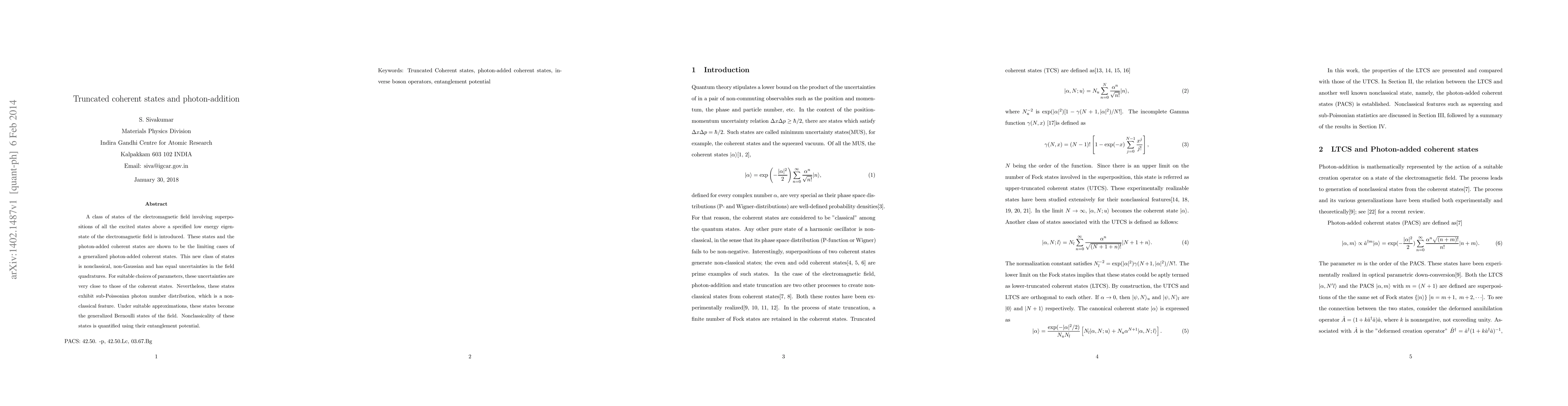 This paper introduces a new class of nonclassical, non-Gaussian electromagnetic field states called truncated coherent states, which exhibit sub-Poissonian photon number distribution and are close to coherent states in uncertainty. These states are shown to be limiting cases of generalized photon-added coherent states and possess significant entanglement potential.