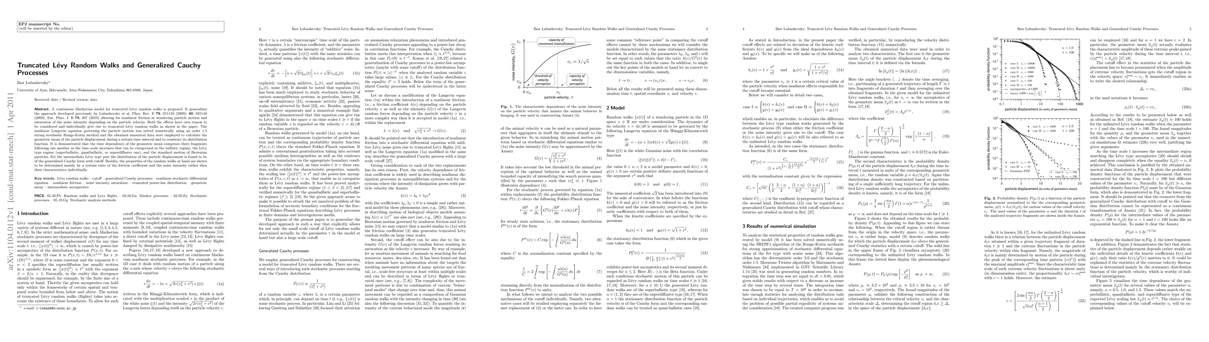 A continuous Markovian model for truncated Levy random walks is proposed. It generalizes the approach developed previously by Lubashevsky et al. Phys. Rev. E 79, 011110 (2009); 80, 031148 (2009), Eur. Phys. J. B 78, 207 (2010) allowing for nonlinear friction in wondering particle motion and saturation of the noise intensity depending on the particle velocity. Both the effects have own reason to be considered and individually give rise to truncated Levy random walks as shown in the paper. The nonlinear Langevin equation governing the particle motion was solved numerically using an order 1.5 strong stochastic Runge-Kutta method and the obtained numerical data were employed to calculate the geometric mean of the particle displacement during a certain time interval and to construct its distribution function. It is demonstrated that the time dependence of the geometric mean comprises three fragments following one another as the time scale increases that can be categorized as the ballistic regime, the Levy type regime (superballistic, quasiballistic, or superdiffusive one), and the standard motion of Brownian particles. For the intermediate Levy type part the distribution of the particle displacement is found to be of the generalized Cauchy form with cutoff. Besides, the properties of the random walks at hand are shown to be determined mainly by a certain ratio of the friction coefficient and the noise intensity rather then their characteristics individually.