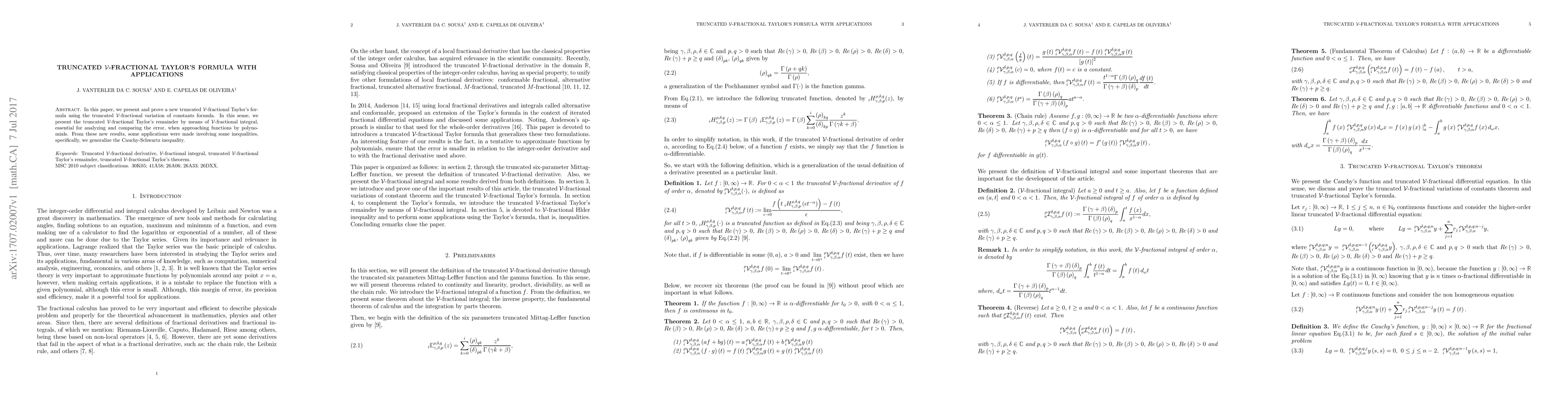 This paper introduces a new truncated $\mathcal{V}$-fractional Taylor's formula, proving it with the truncated $\mathcal{V}$-fractional variation of constants formula. It also generalizes the Cauchy-Schwarz inequality and provides applications involving inequalities.
