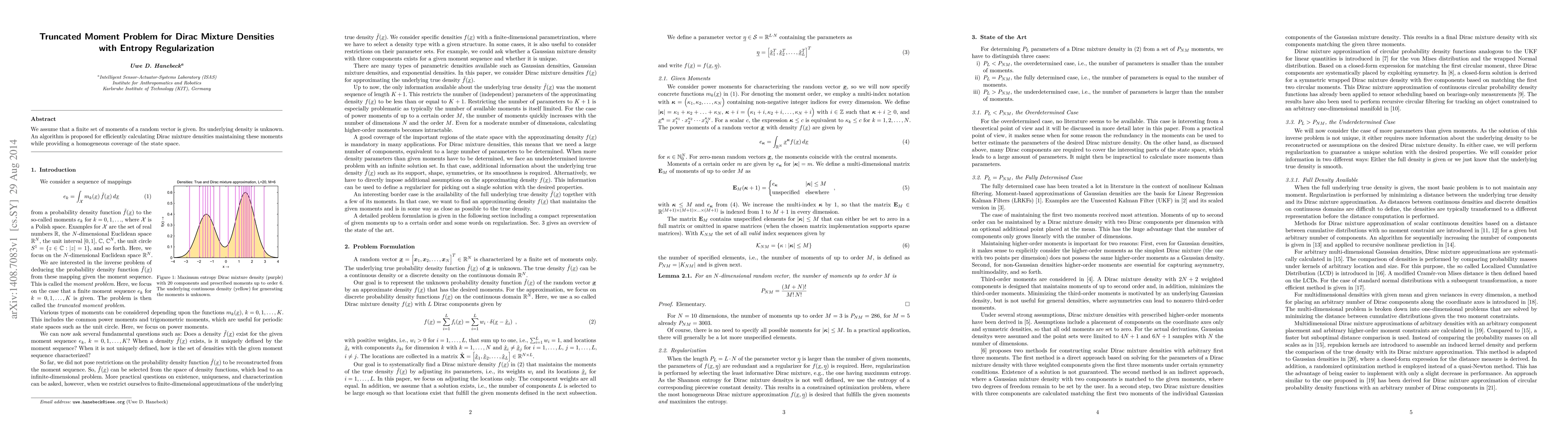 We assume that a finite set of moments of a random vector is given. Its underlying density is unknown. An algorithm is proposed for efficiently calculating Dirac mixture densities maintaining these moments while providing a homogeneous coverage of the state space.