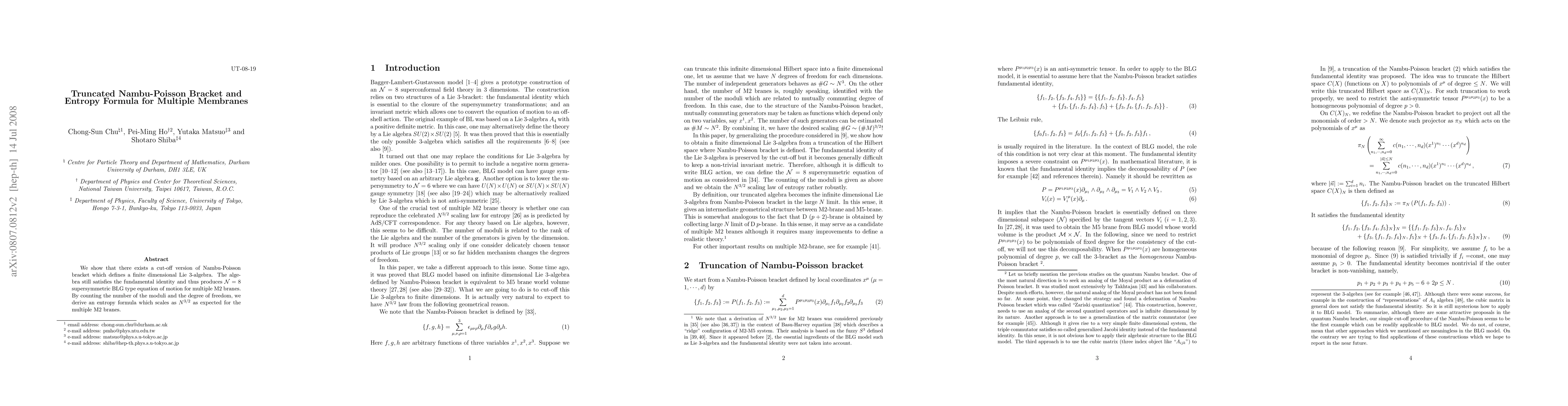 Summary: This paper introduces a truncated Nambu-Poisson bracket to define a finite-dimensional Lie 3-algebra, which corresponds to the N=8 supersymmetric BLG equations for multiple M2 membranes, and derives an entropy formula that scales as N^{3/2}.