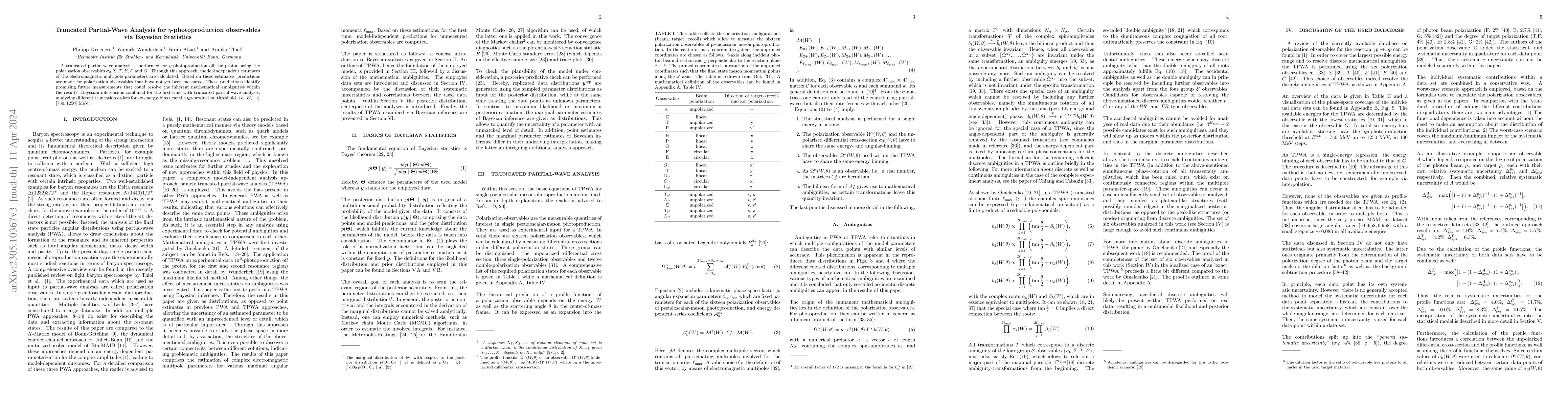 This study employs truncated partial-wave analysis and Bayesian statistics to analyze $\eta$-photoproduction observables, examining various polarization parameters across different energy bins. The research aims to identify and evaluate emerging ambiguities and proposes future measurements to resolve these uncertainties.