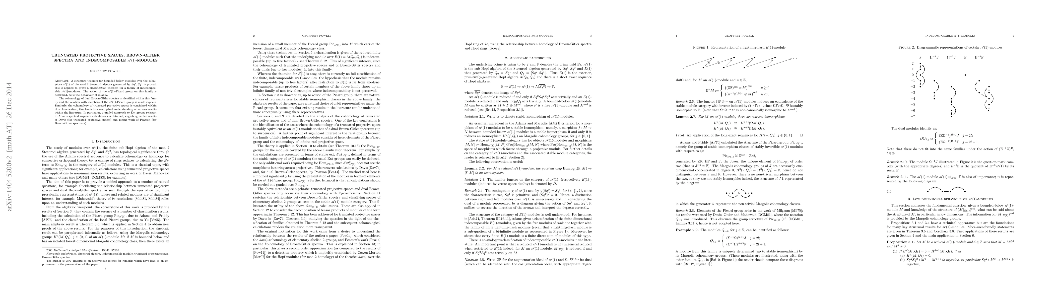 A structure theorem for bounded-below modules over the subalgebra A(1) of the mod 2 Steenrod algebra generated by Sq^1, Sq^2 is proved; this is applied to prove a classification theorem for a family of indecomposable A(1)-modules. The action of the A(1)-Picard group on this family is described, as is the behaviour of duality. The cohomology of dual Brown-Gitler spectra is identified within this family and the relation with members of the A(1)-Picard group is made explicit. Similarly, the cohomology of truncated projective spaces is considered within this classification; this leads to a conceptual understanding of various results within the literature. In particular, a unified approach to Ext-groups relevant to Adams spectral sequence calculations is obtained, englobing earlier results of Davis (for truncated projective spaces) and recent work of Pearson (for Brown-Gitler spectra).