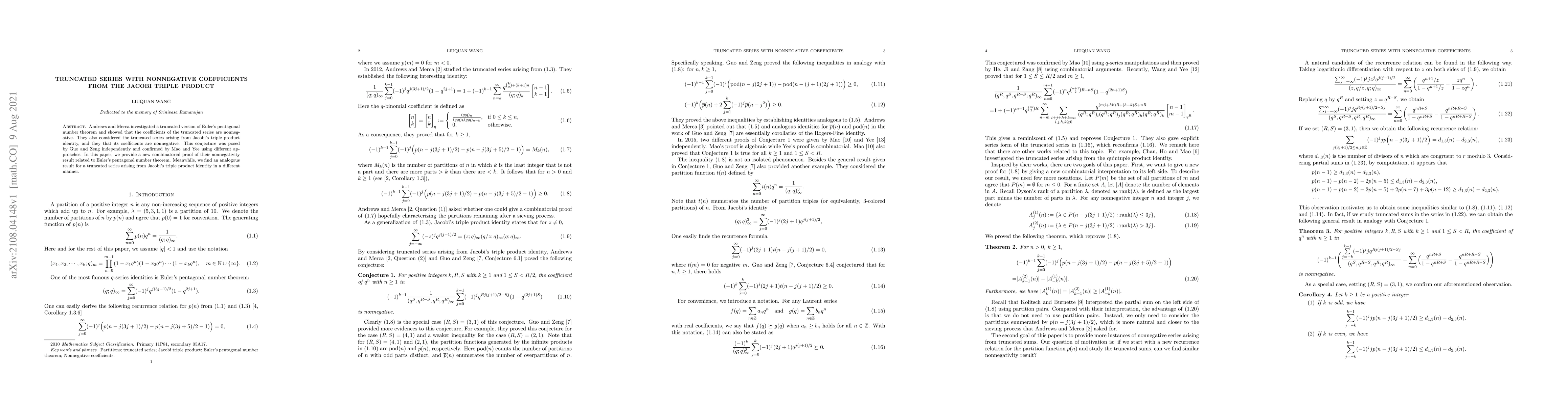 This paper provides a new combinatorial proof for the nonnegativity of coefficients in truncated series from Euler's pentagonal number theorem and finds an analogous result for a truncated series derived from Jacobi's triple product identity, confirming earlier conjectures.