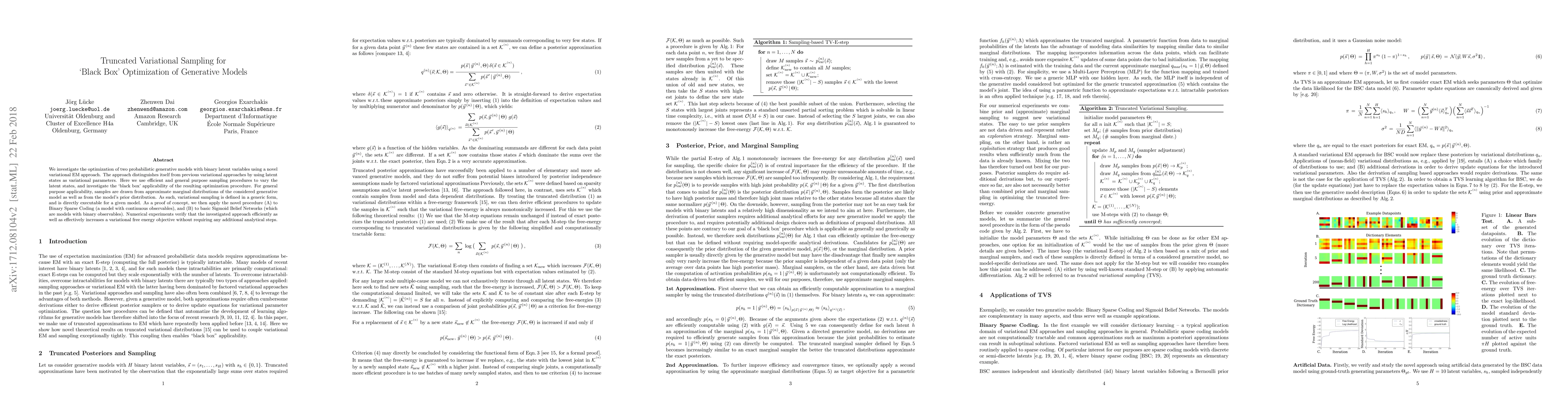 This paper proposes a novel variational EM approach for optimizing generative models with binary latent variables, utilizing truncated variational sampling. The method efficiently increases variational free energy by sampling from approximate marginal distributions and priors, demonstrating its effectiveness and "black box" applicability through experiments on Binary Sparse Coding and Sigmoid Belief Networks.