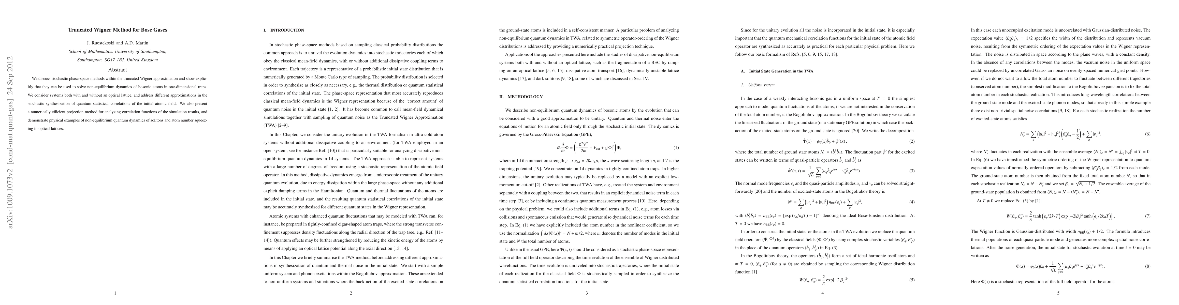The paper explores the truncated Wigner method for solving non-equilibrium dynamics of bosonic atoms in one-dimensional traps, both with and without optical lattices, and introduces a numerically efficient projection method for analyzing correlation functions. It demonstrates physical examples of solitons and atom number squeezing in optical lattices.
