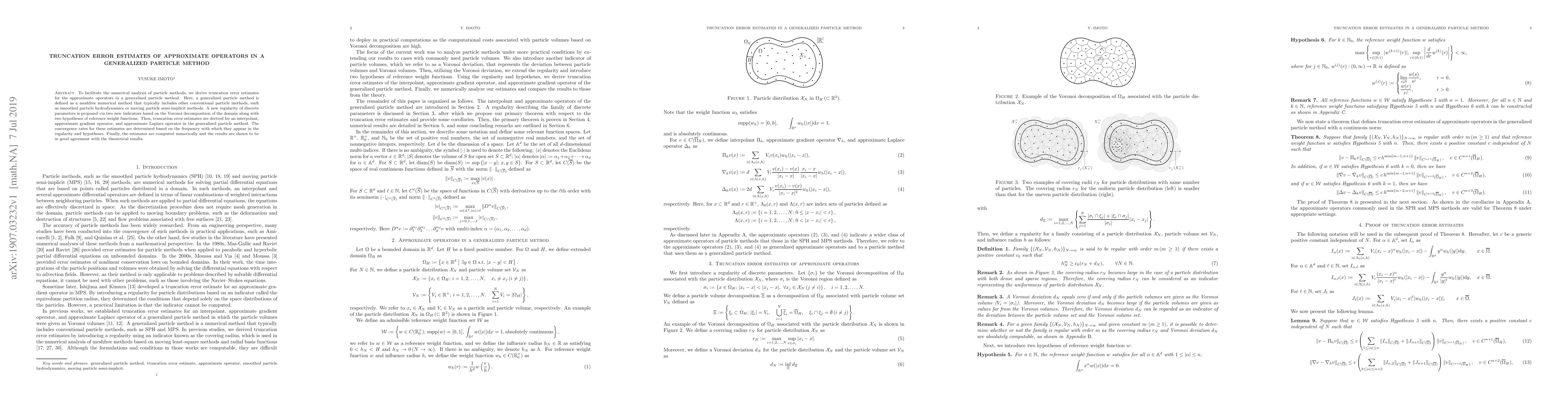This paper derives truncation error estimates for approximate operators in a generalized particle method, including an interpolant, approximate gradient, and Laplace operator. The analysis introduces new regularity indicators based on Voronoi decomposition and reference weight functions, and the results show good numerical agreement with theoretical convergence rates.