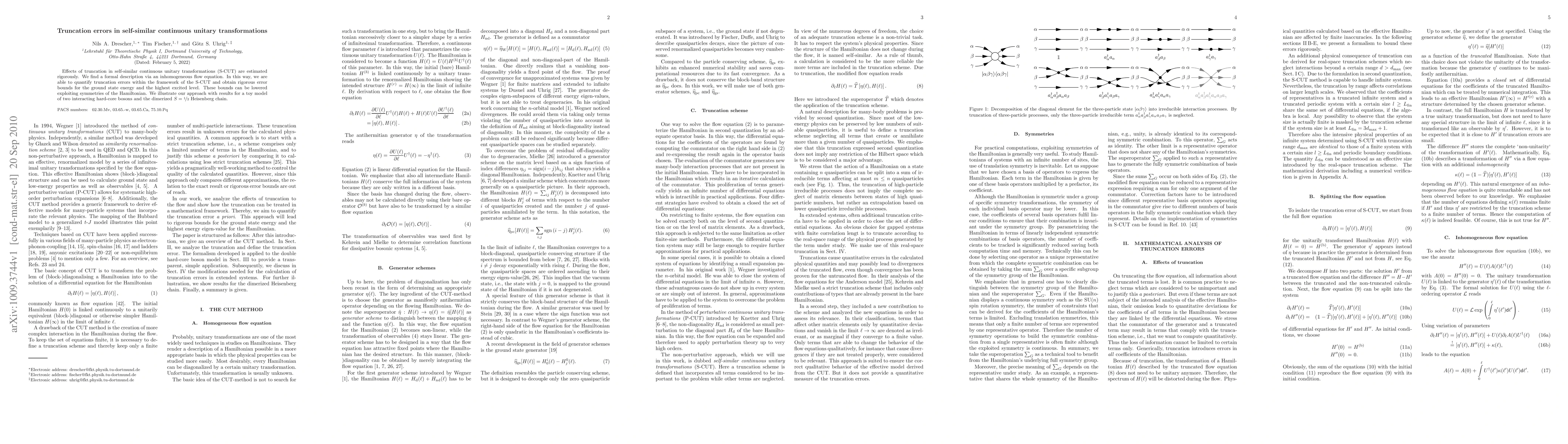 This paper rigorously estimates truncation errors in self-similar continuous unitary transformations (S-CUT), providing a formal description through an inhomogeneous flow equation. It quantifies these errors and establishes rigorous error bounds for ground state energy and the highest excited level, which can be improved by leveraging Hamiltonian symmetries.